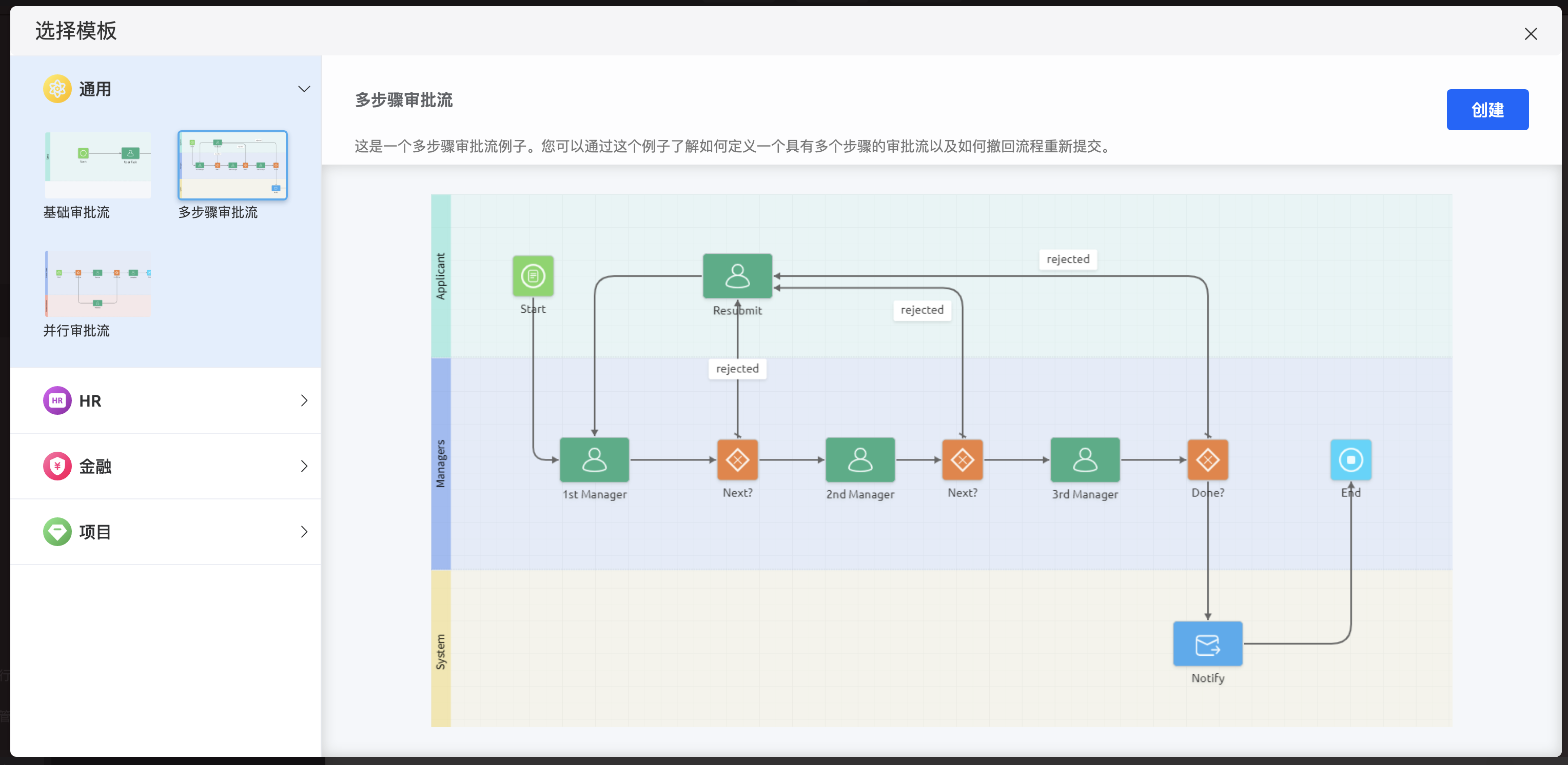 在展示的模板类型中,选择「通用」中的「多步骤审批流」模板后,单击「创建」。