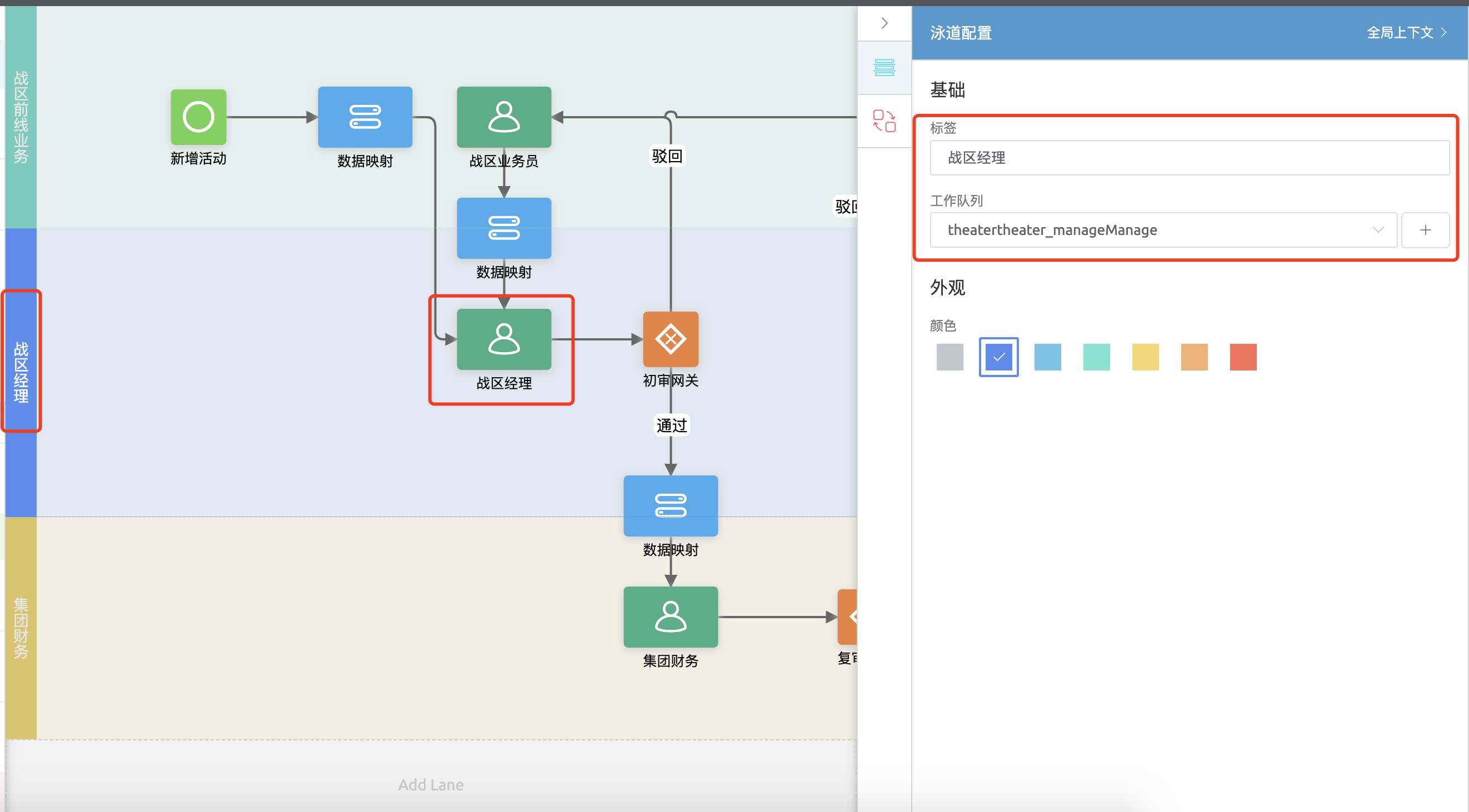 单击「活动初审」泳道,配置工作队列为“theater_manage”。