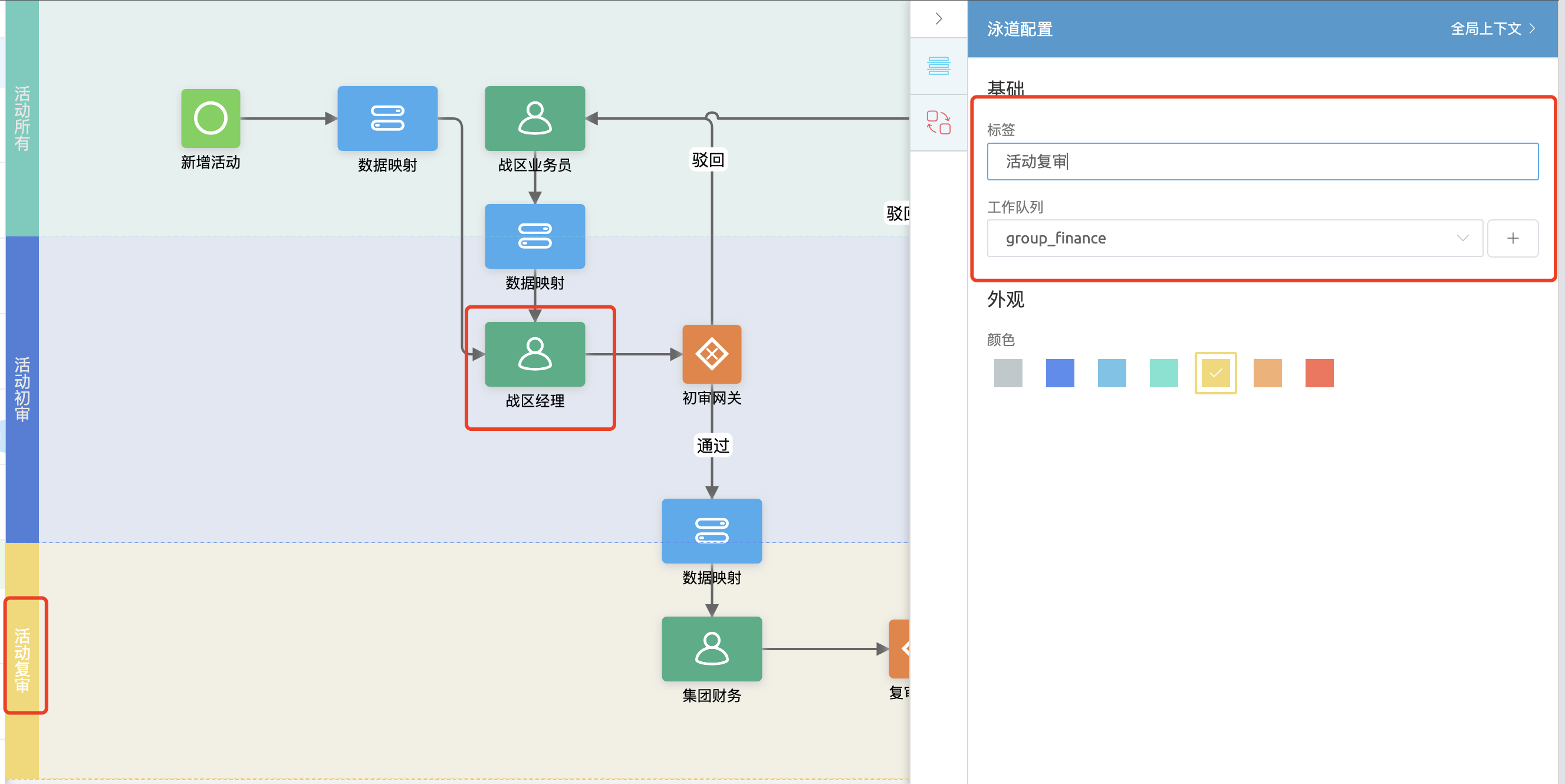 单击「活动复审」泳道,配置工作队列为“group_finance”。