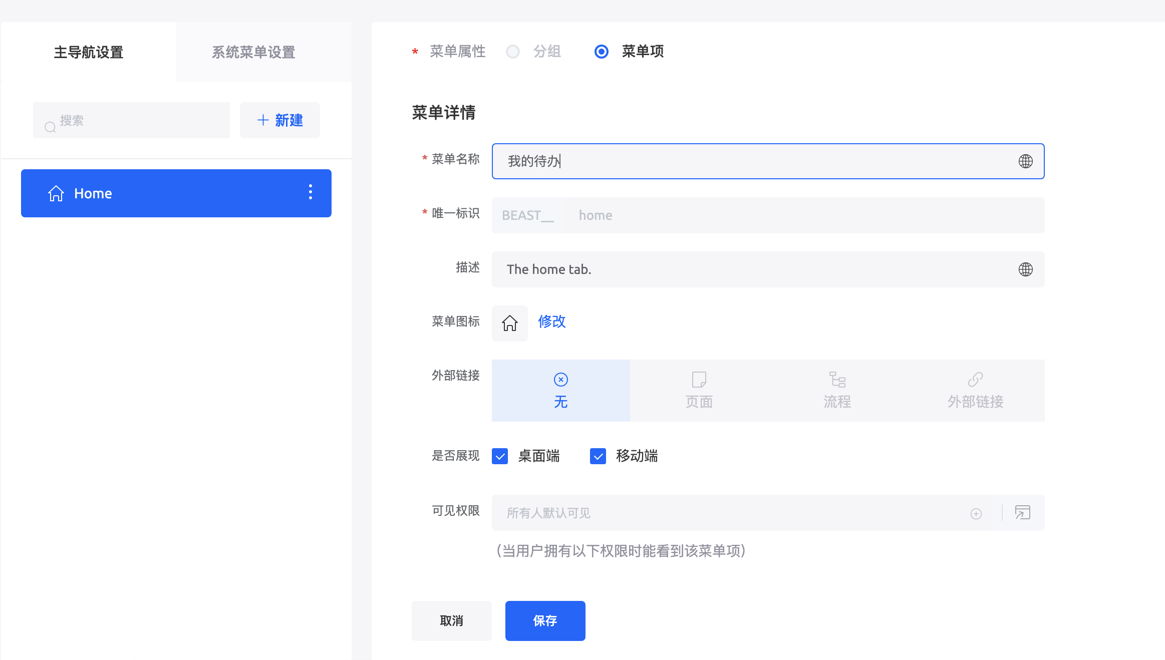 2、在「主导航设置」页签中,单击「Home」,将「菜单名称」设置为「我的待办」,并保存。