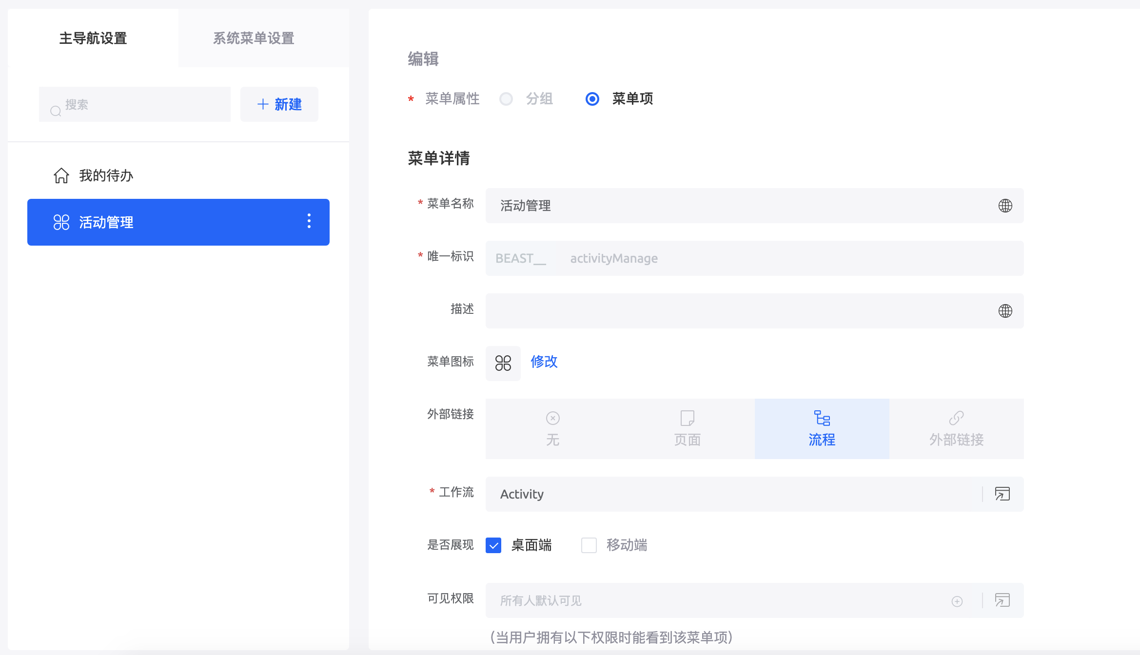 设置唯一标识,并将「外部链接」设置为流程,选择对应的工作流「Activity」。