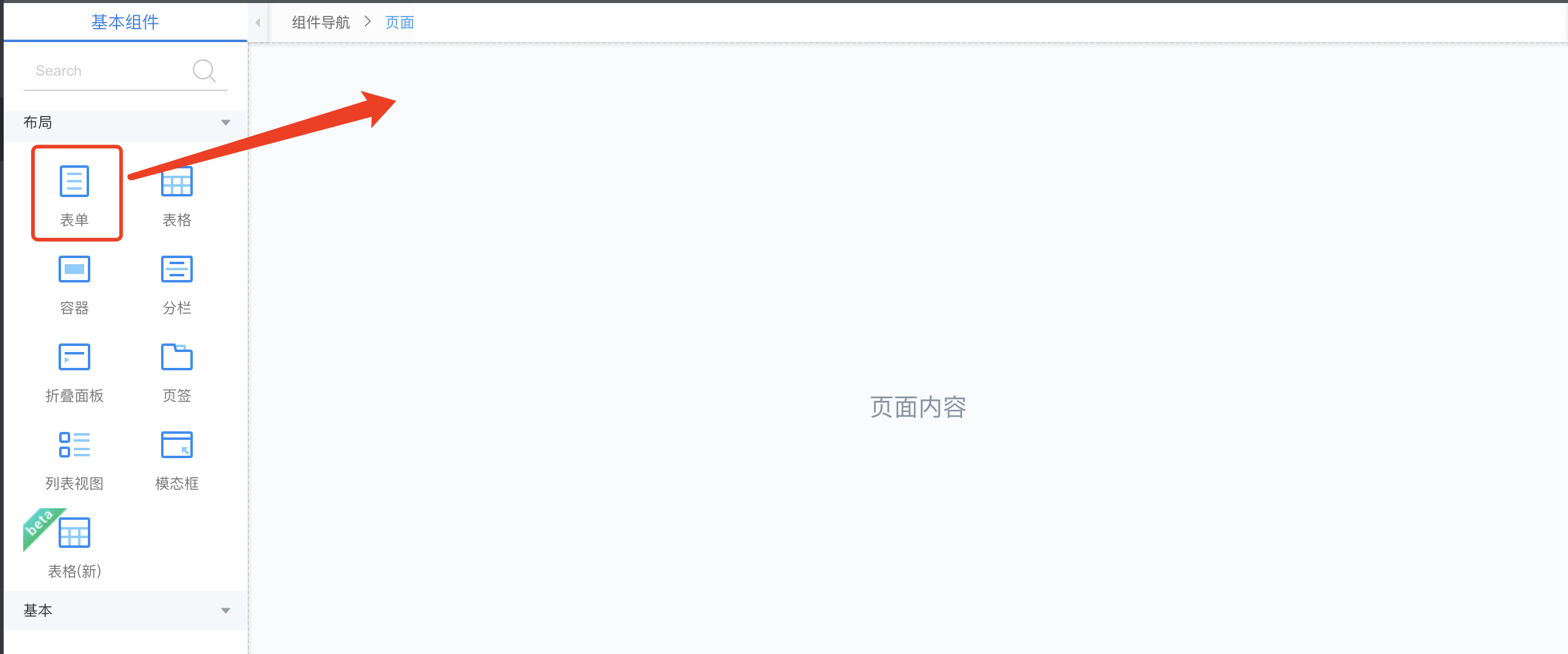 4、从“基本组件 > 布局”中,拖一个表单到页面中。