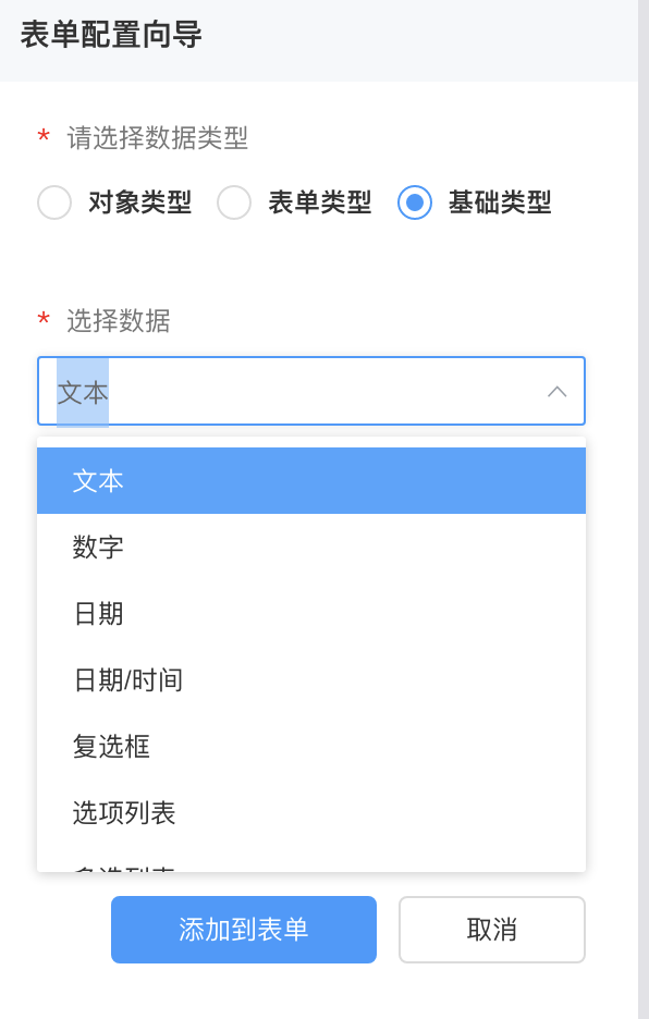 5、「表单配置向导」选择「基础类型」,数据类型包括了基本上所有的主流类型。