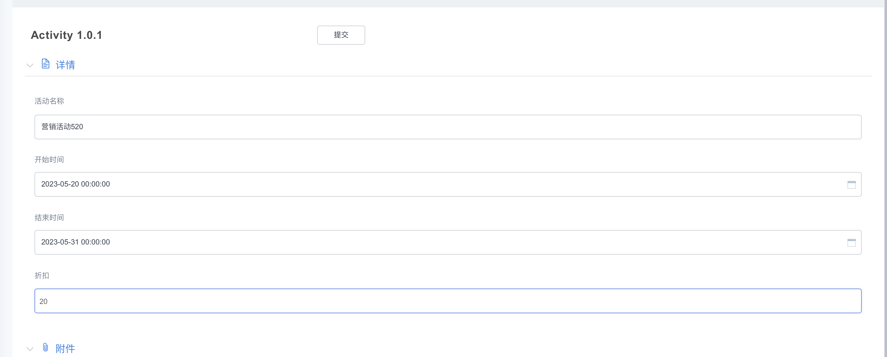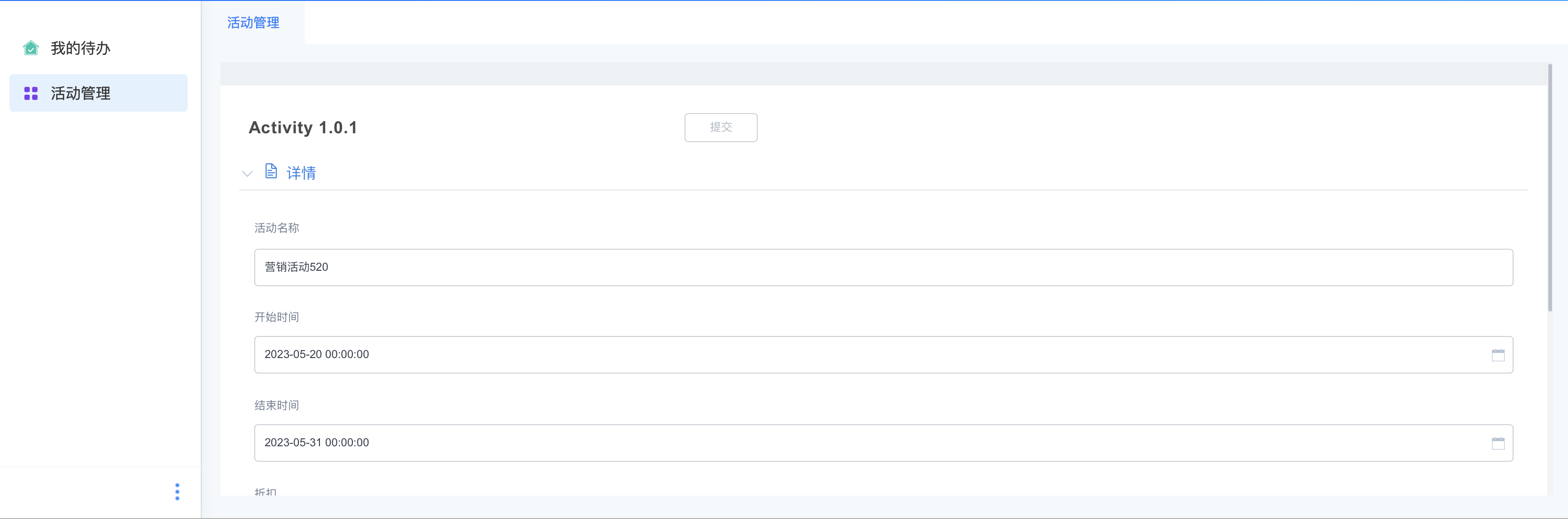 2.2 进入「activity」应用预览页面。单击「活动管理」,填写活动信息,单击「提交」。