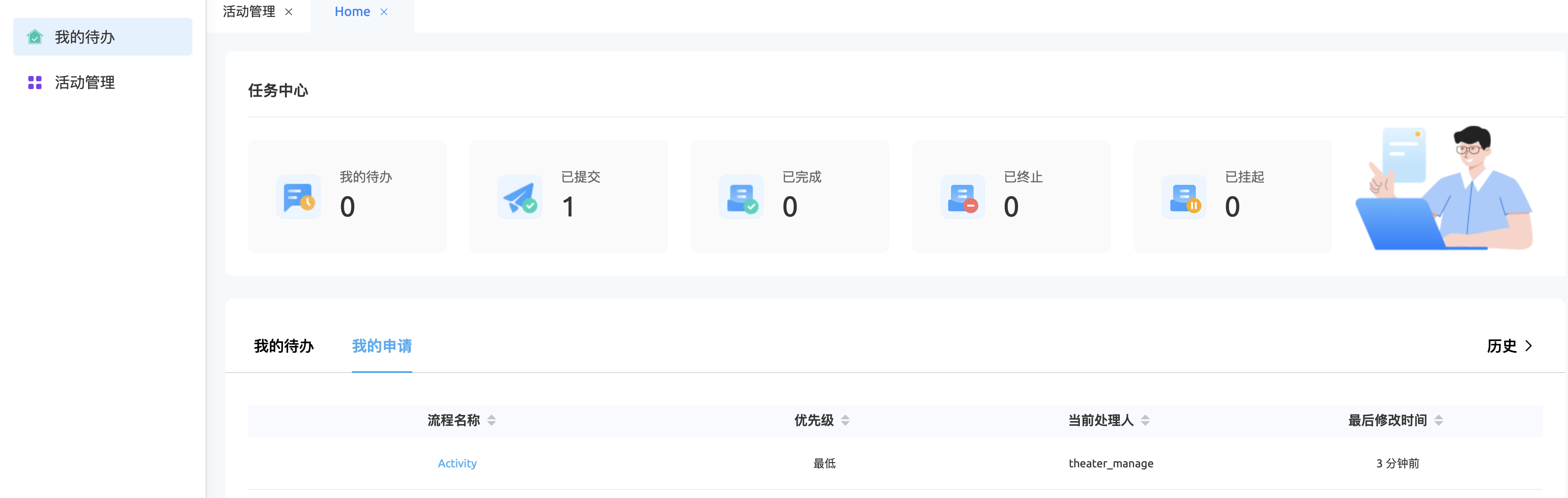 2.3 提交成功之后,在「我的待办 > 我的申请」中,可查看到已提交的「活动」电子流。