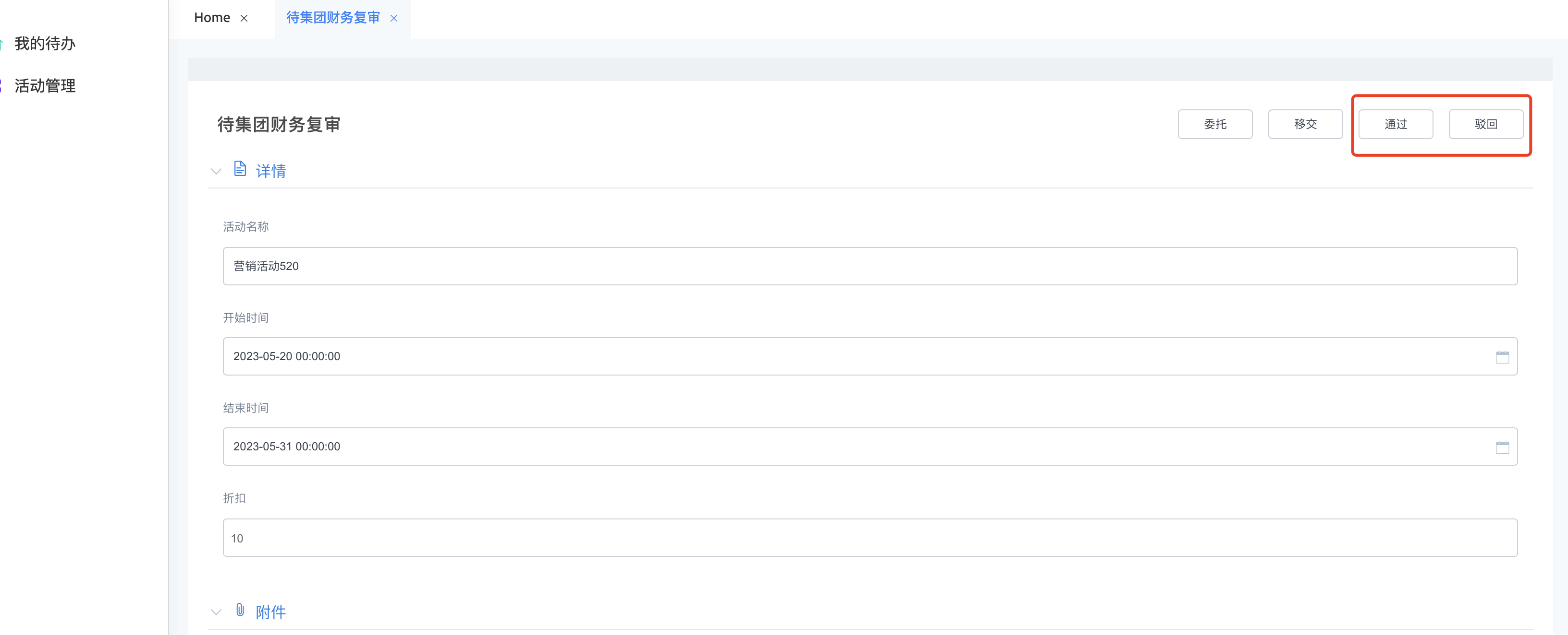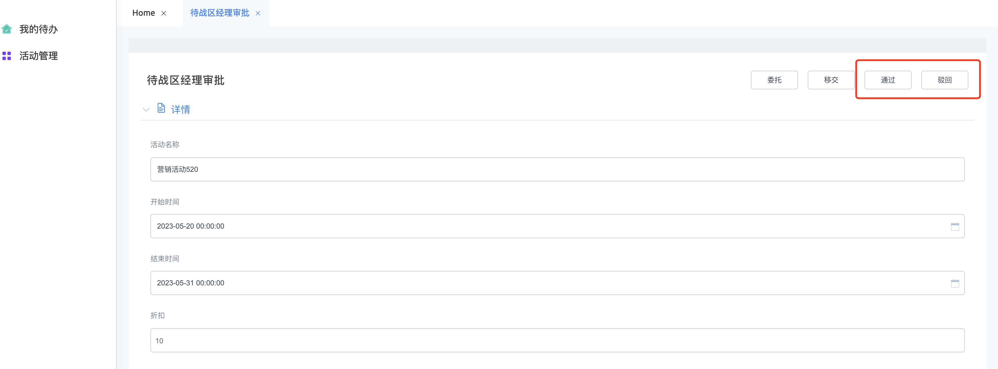 3.2 审批页面,可以进行通过操作,也可以进行驳回操作。