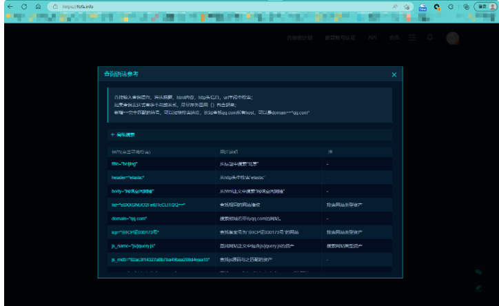 输入之后,可以配合左边的一些提示,进行查看是否有你要找的相关资产,然后点一下就加到了你的搜索语法