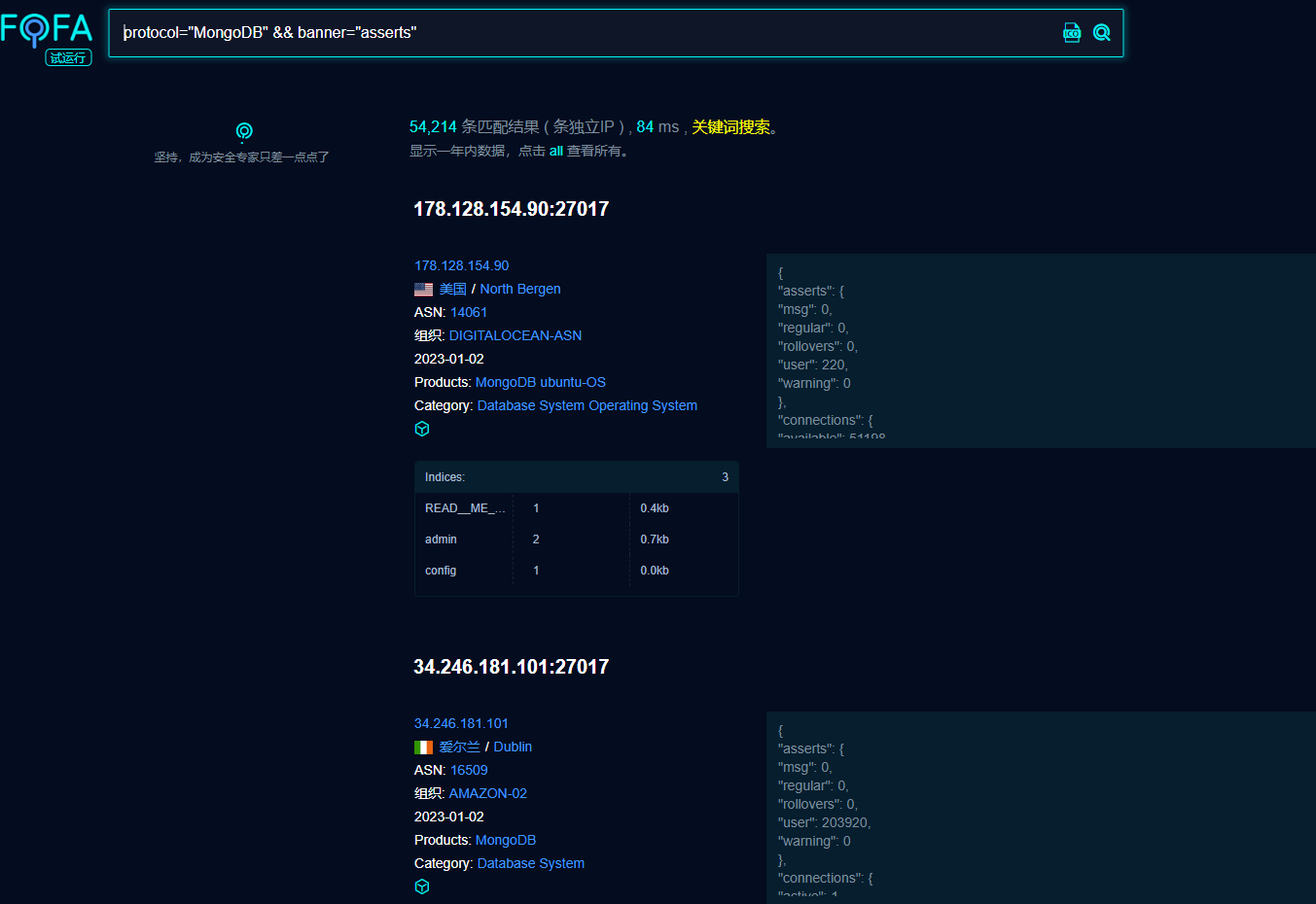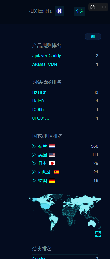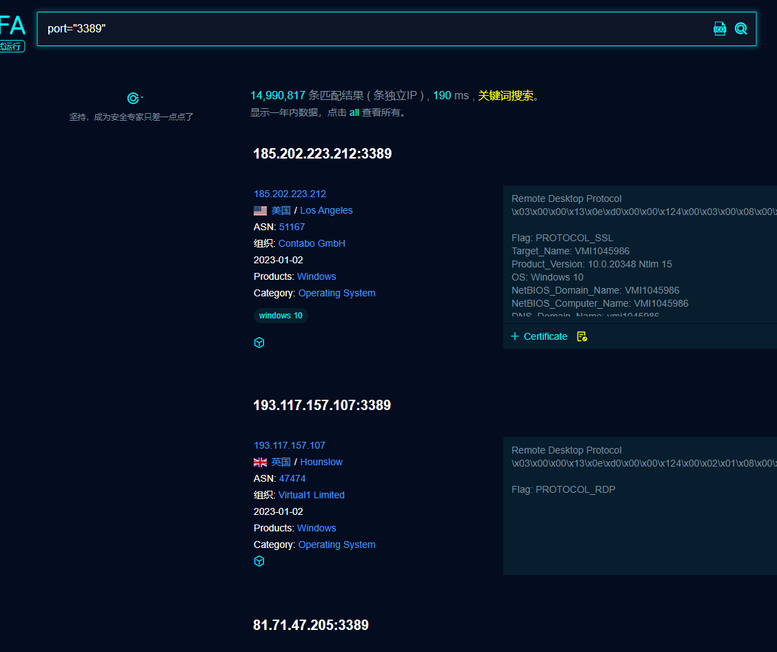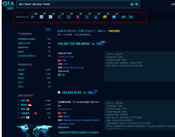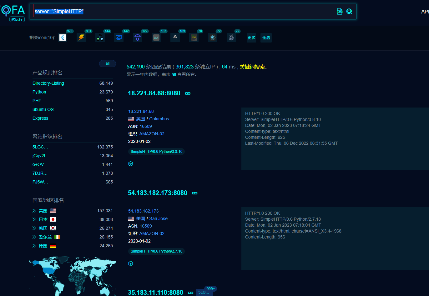 如类型分布、年份、特征、国家/地区排名、端口排名、Server排名、协议排名、操作系统排名、网站标题排名、证书持有者排名、证书有效性、ASN排名、组织排名、TCP/UDP、IPV4/IPV6等等,可以查找到自己想要的资产,举一个例子,其他操作具体自行尝试。