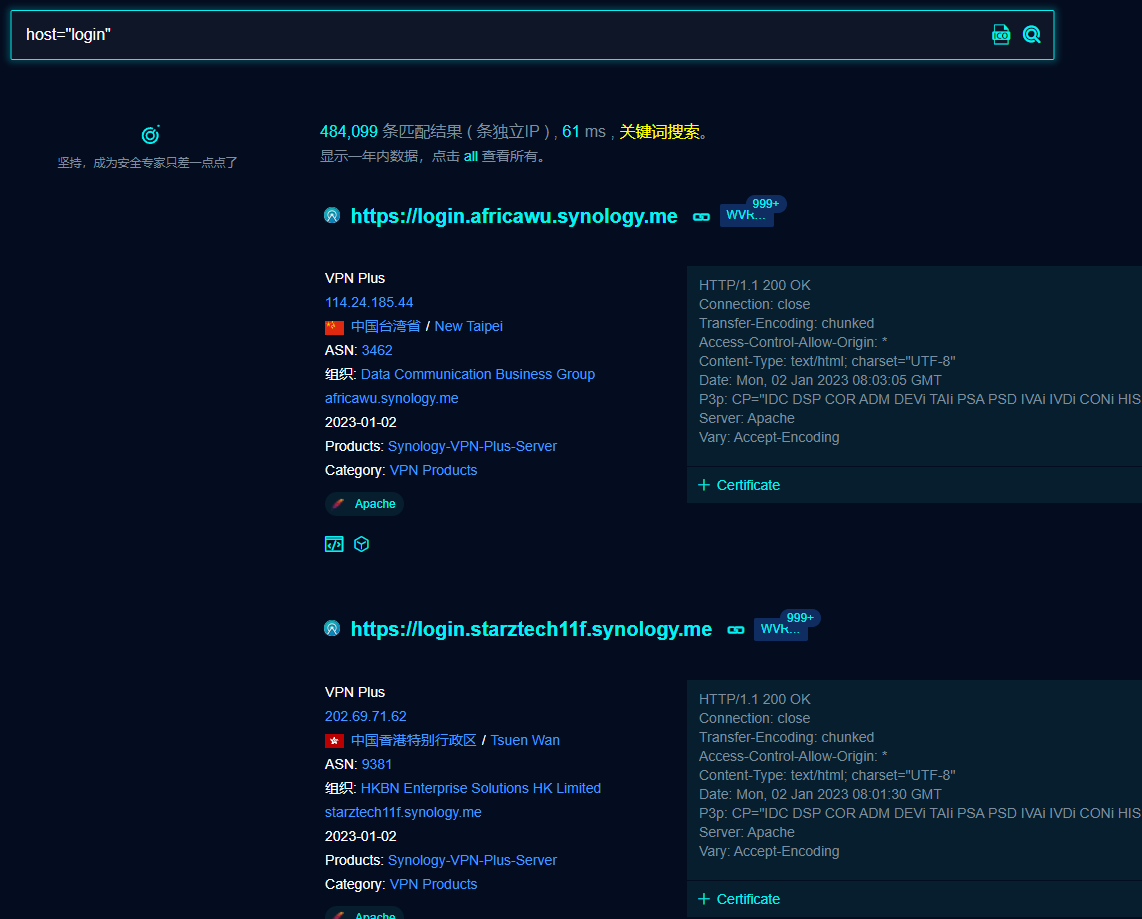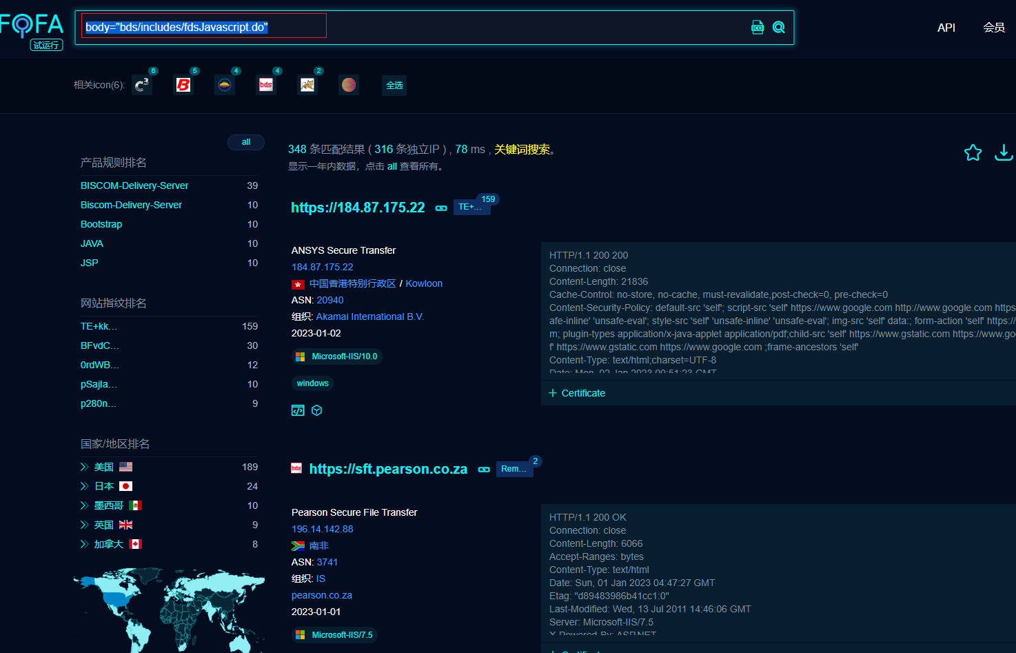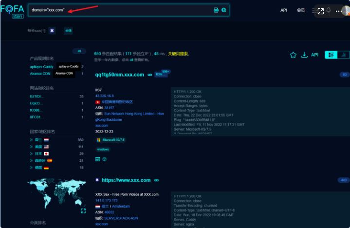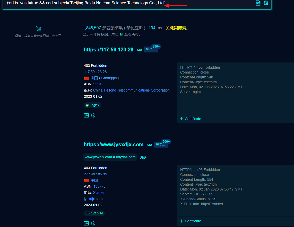 使用fofa搜索证书可以查找同类证书网站,还可以查找真实ipwww.t00ls.com6 V% h1 b( X4 S0 v% V M# q