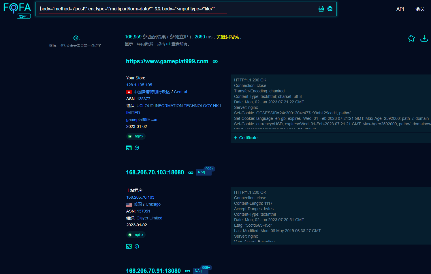 结合这两个特性,就可以使用FOFA发现页面的文件上传接口,如: