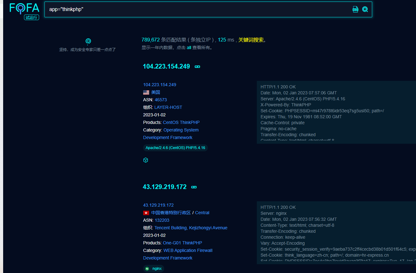 搜索HTTP响应头中含有"thinkphp"关键词的网站