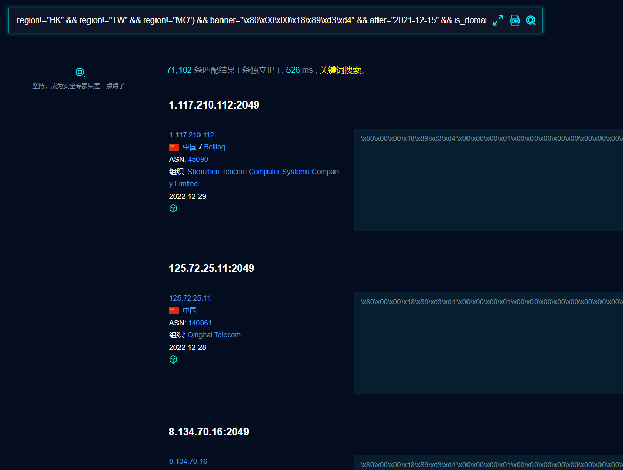 protocol="nfs" && (country="CN" && region!="HK" && region!="TW" && region!="MO") && banner="\x80\x00\x00\x18\x89\xd3\xd4" && after="2021-12-15" && is_domain=false