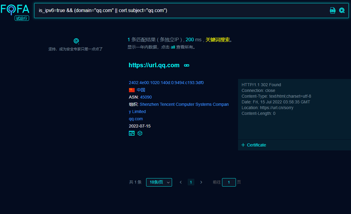 is_ipv6=true && (domain="qq.com" || cert.subject="qq.com") && is_fraud=false && is_honeypot=false