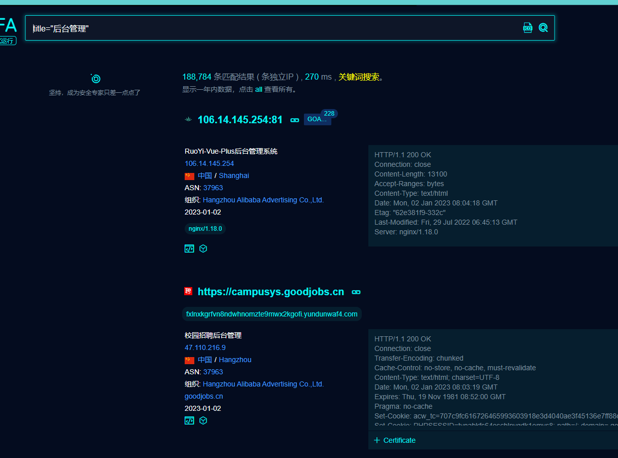 搜索页面标题中含有“后台管理”关键词的网站和IP地址