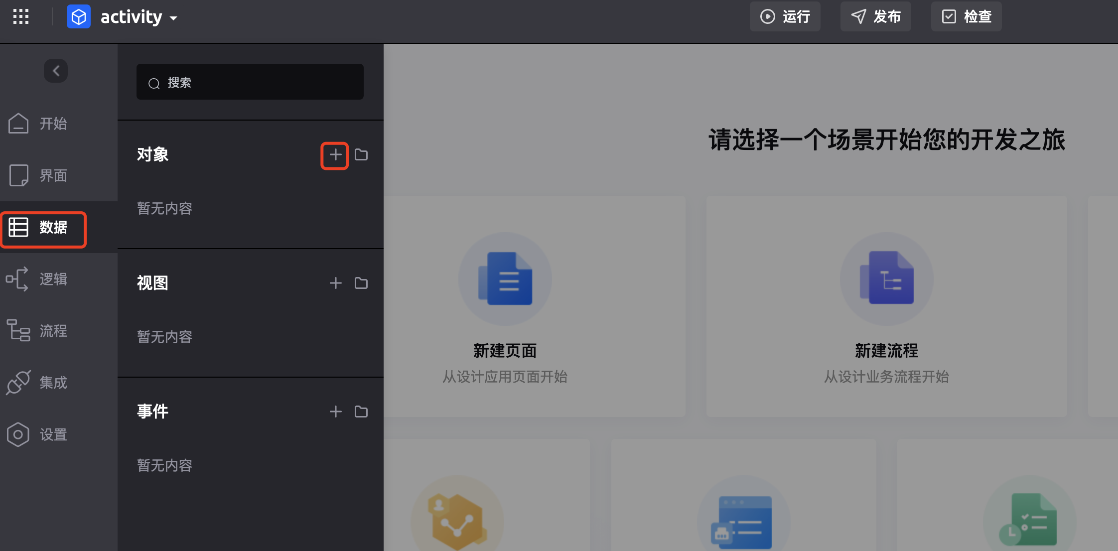 2、登录新版应用设计器,选择「数据」,点击「对象」后的➕,进入创建对象页面。