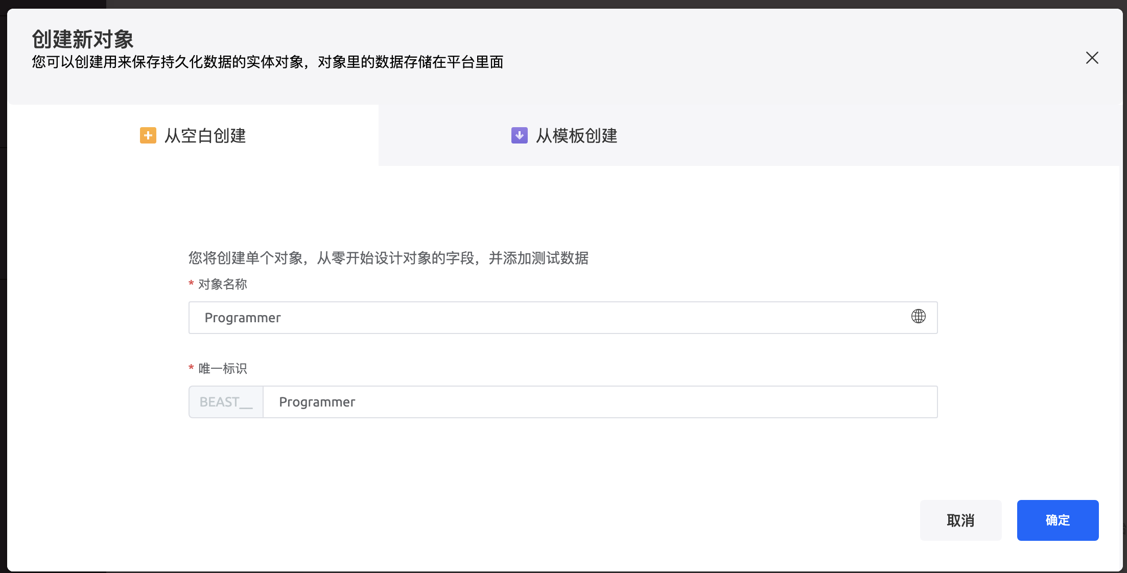 对象中选择前置工作中创建的对象Programmer,设置字段描述信息(可选),单击「保存」。