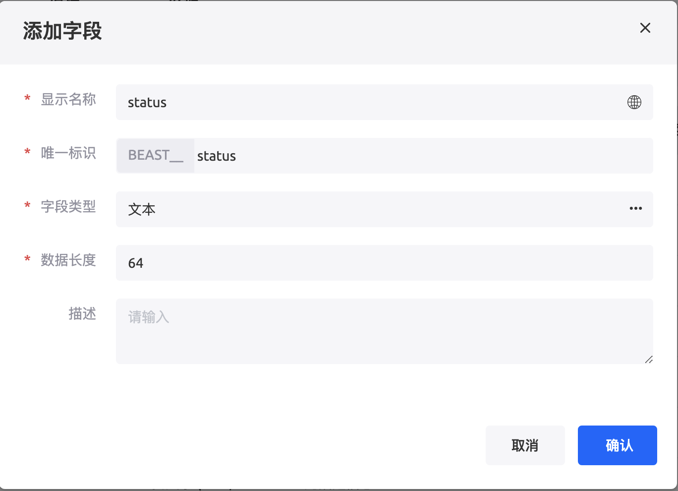 设置字段显示名称和唯一标识为status,字段类型设置为「文本」,单击「确认」。