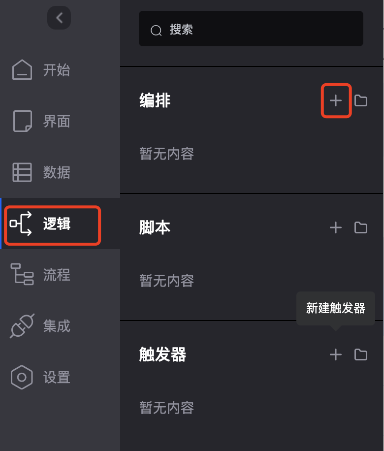 1、在左侧导航栏中,选择「逻辑」,单击编排后的「➕」,进入添加编排页面。