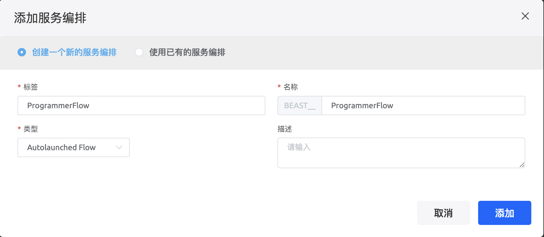 2、创建服务编排 ProgrammerFlow,录入必填项,单击「添加」。