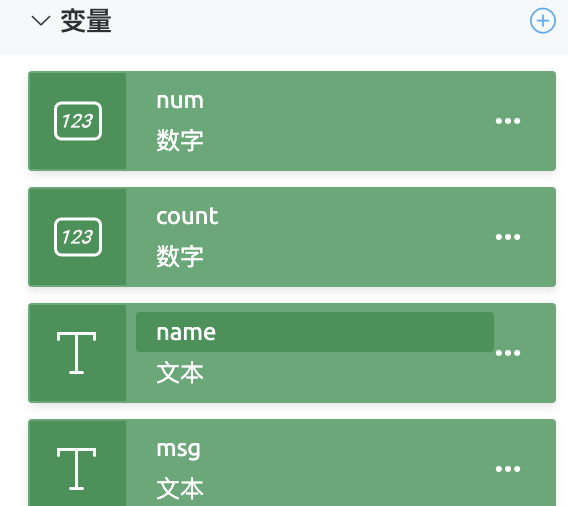 5、参考上述操作,创建其他普通变量count(数字类型)、name(文本类型)和 msg(文本类型)。