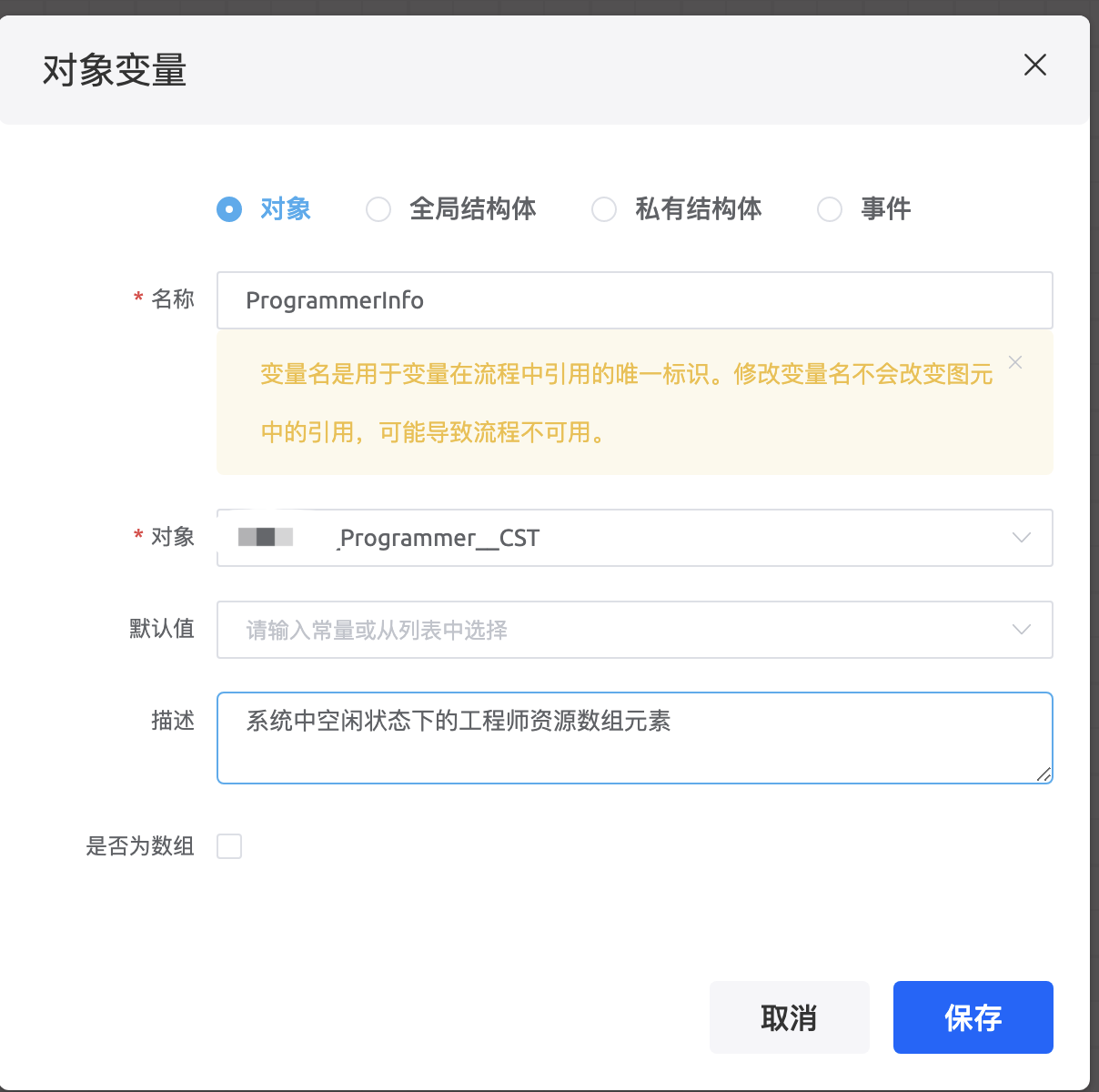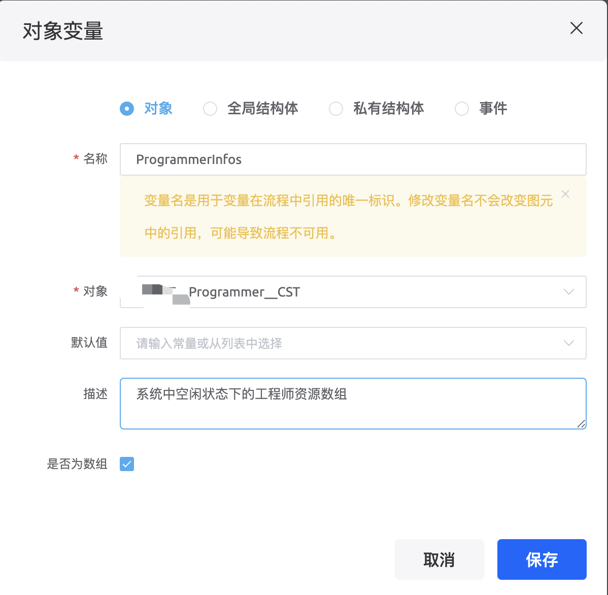 对象中选择前置工作中创建的对象Programmer,设置字段描述信息(可选),选中「是否为数组」,单击「保存」。