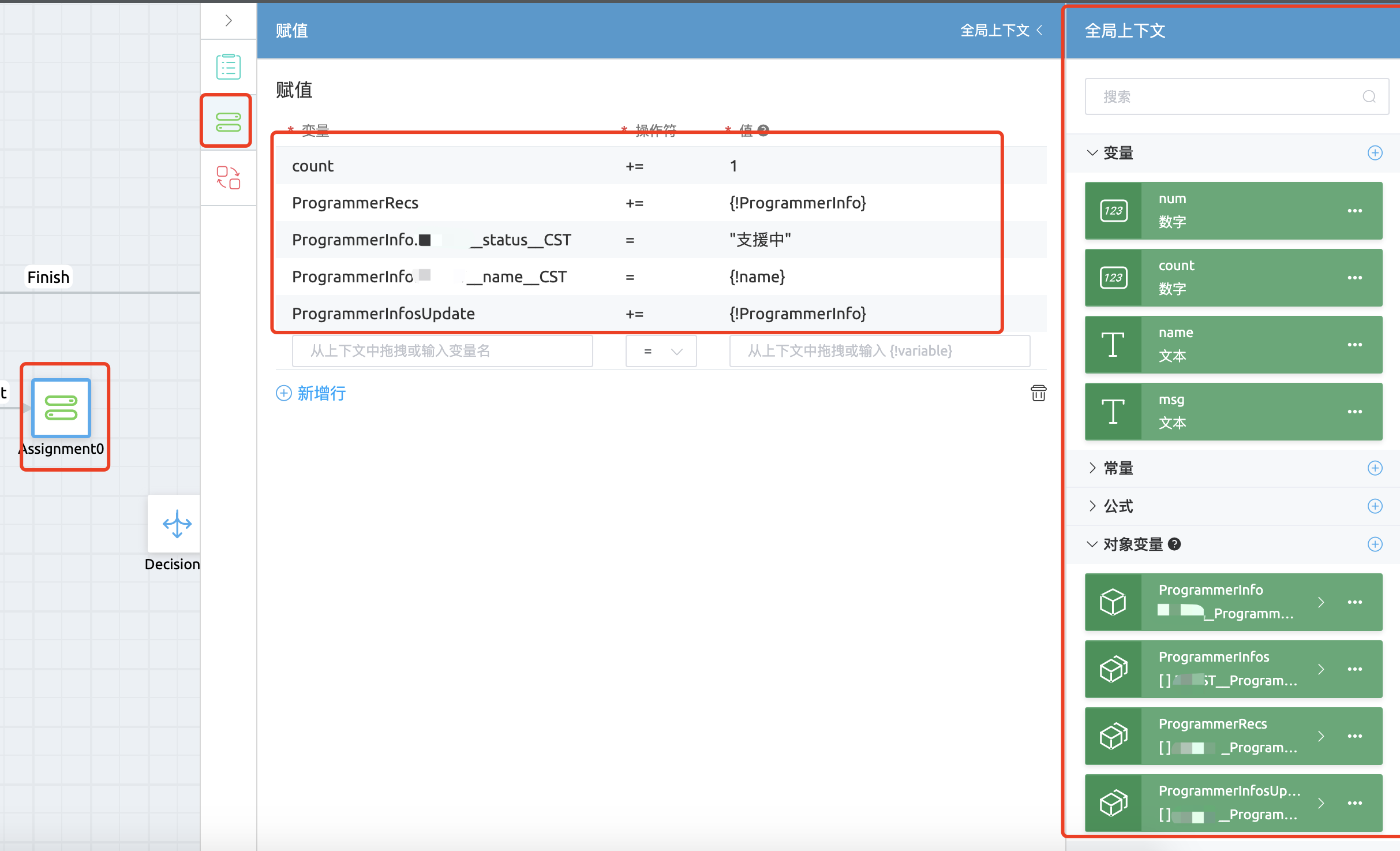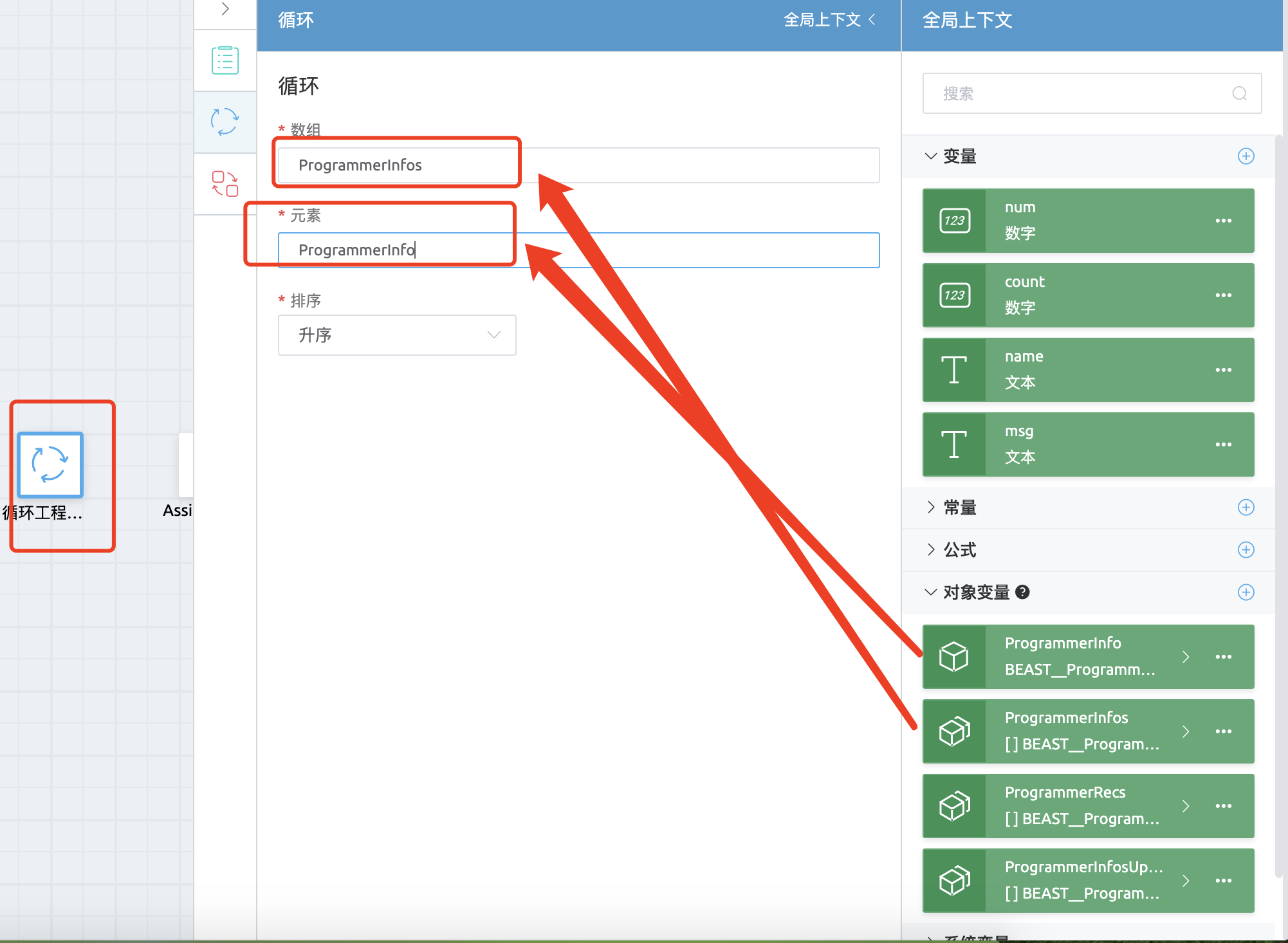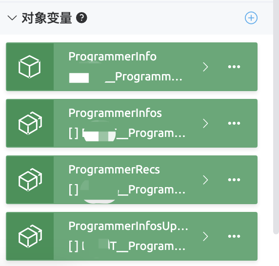 6、在全局上下文页面,单击「对象变量」后的「➕」,创建对象变量ProgrammerInfo。