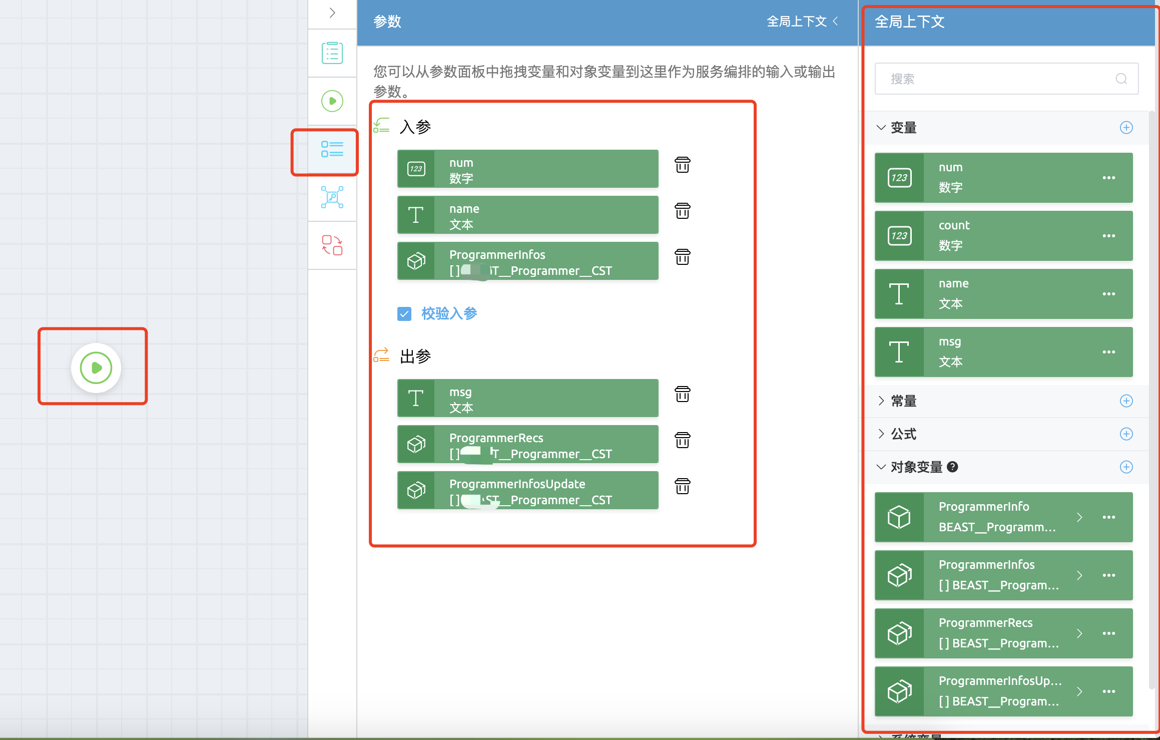 将变量num、nanme、ProgrammerInfos 拖拽到「入参」中,将变量msg、ProgrammerRecs、ProgrammerInfosUpdate拖拽到「出参」中。