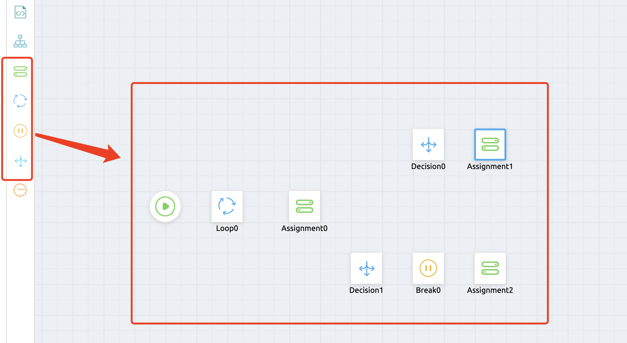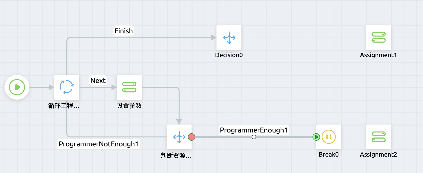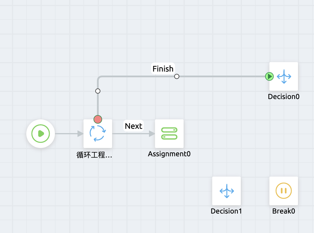 2、开始图元后面新增“赋值”、“循环”、“跳出循环”和“决策”等图元,注意摆放位置。