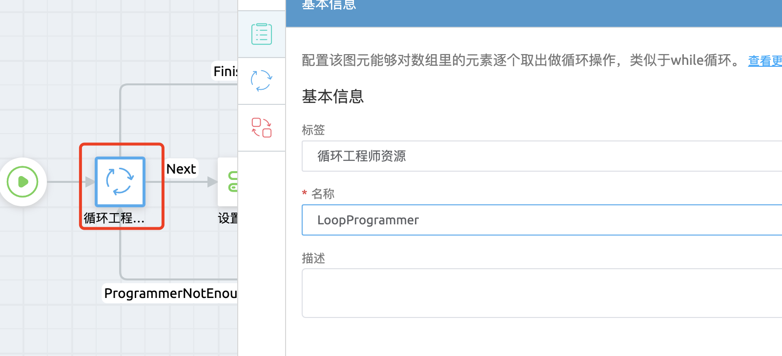单击画布中的循环图元,在「基本信息」页面中配置图元“标签”为“循环工程师资源”、“名称”为“LoopProgrammer”。