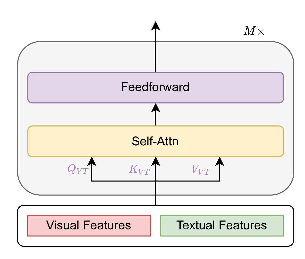 单流架构指将文本和视觉特征连接在一起,然后馈送到单个Transformer块中,如下图所示,单流结构利用合并的注意力来融合多模态输入。