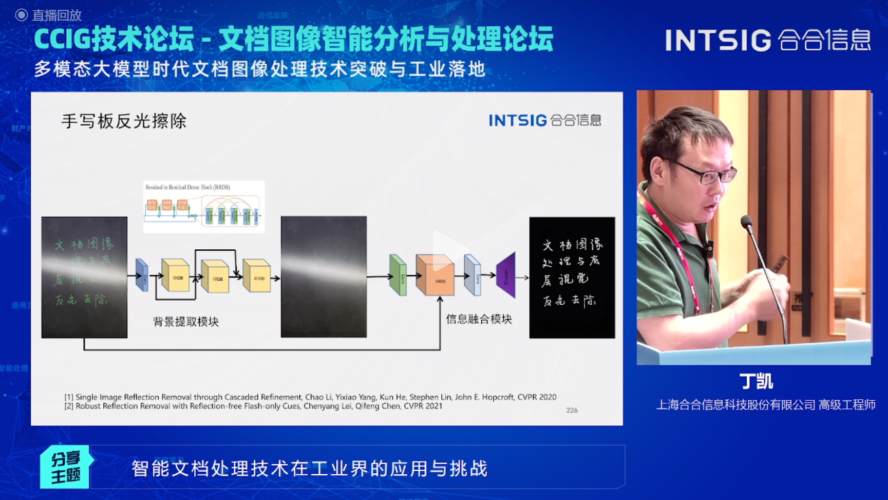 在拍摄黑板上的文字时,由于光线的反射和折射,会产生反光干扰,影响手写内容的识别和显示。合合信息在手写板反光抑制技术中使用了背景提取模块和信息融合模块。