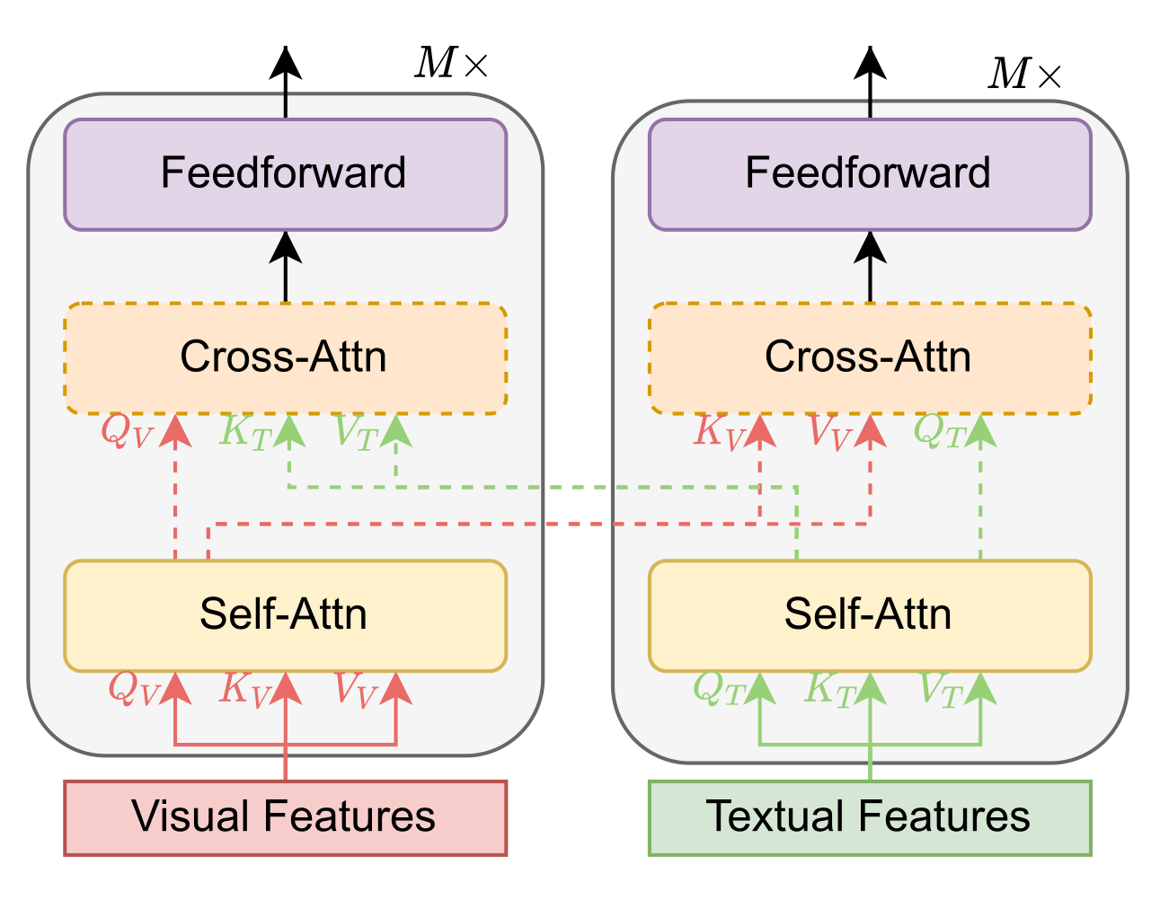 多信息流架构是指文本和视觉特征不连接在一起,而是单独发送到两个不同的Transformer块,如下图所示。这两个Transformer块不共享参数,而为了获得更高的性能,一般使用交叉注意来实现跨模态交互。