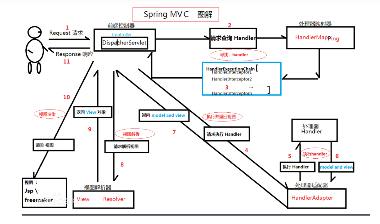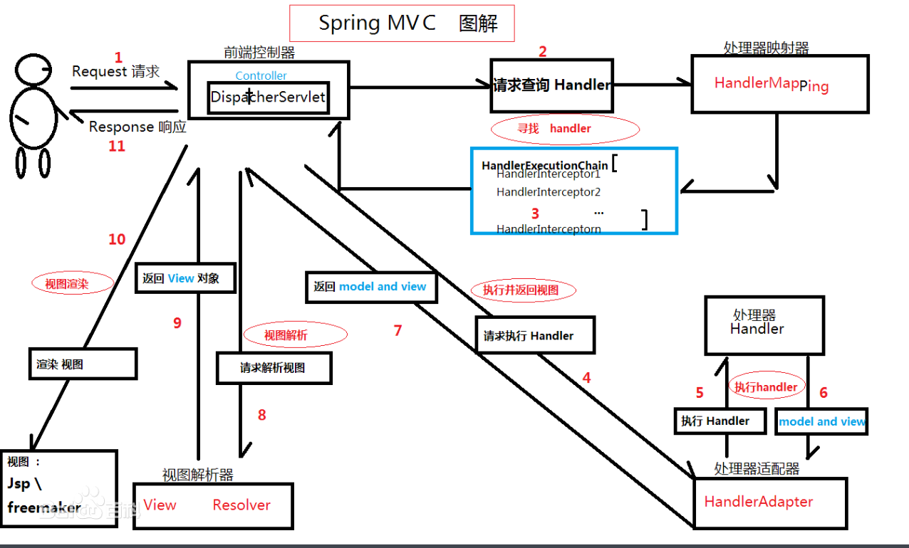 在返回来看下这个DispatchServlet的处理内容大概就比较有感觉了,上述处理在第九步的,返回了view的内容。