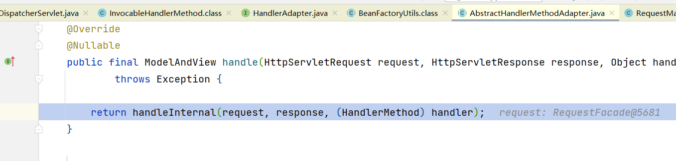 在DispatcherServlet 的doDispatch 中通过HandlerAdapter 的handle 方法来处理请求