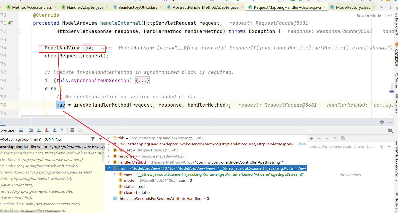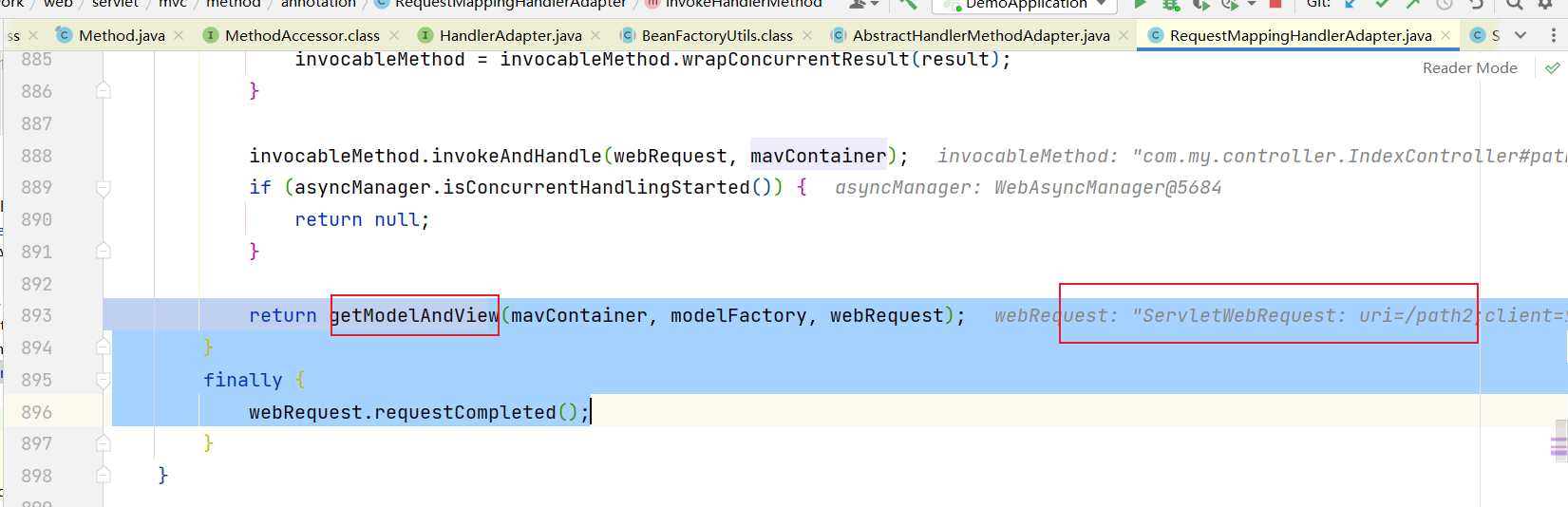 然后在handleReturnValue 中调用invokeHanderMethod方法来进行处理,接着调用RequestMappingHandlerAdapter的 getModelAndView 来处理,处理完成后返回对应的ModelAndView实例