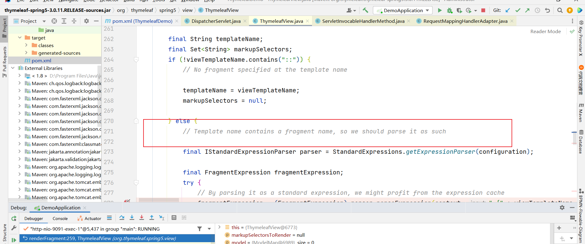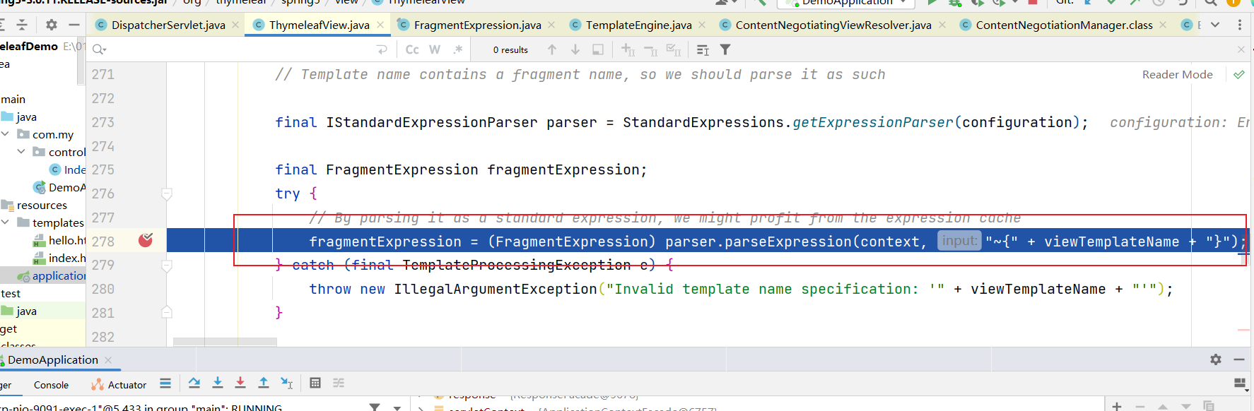- 在render中调用,org.thymeleaf.spring5.view.ThymeleafView#renderFragment,并且通过pareseExpression处理viewTemplateName 模板的名称,并且给viewTemplateName 的名称加上了~{ }表达式的处理标志符号