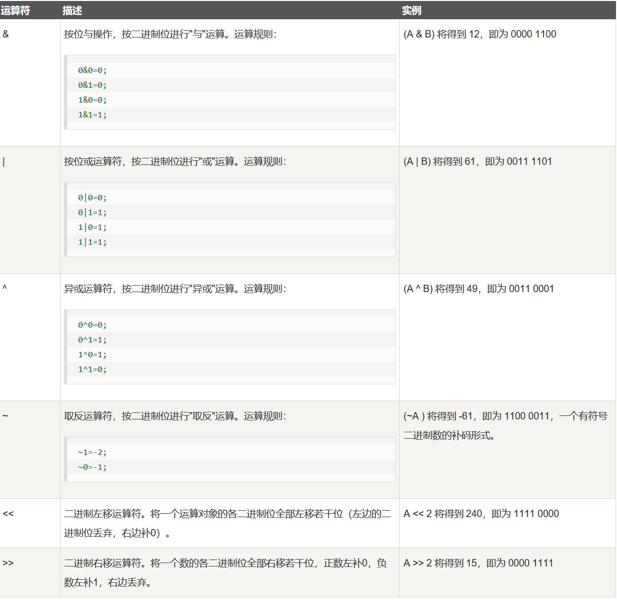位运算符作用于位,并逐位执行操作。&、 | 和 ^ 的真值表如下所示: