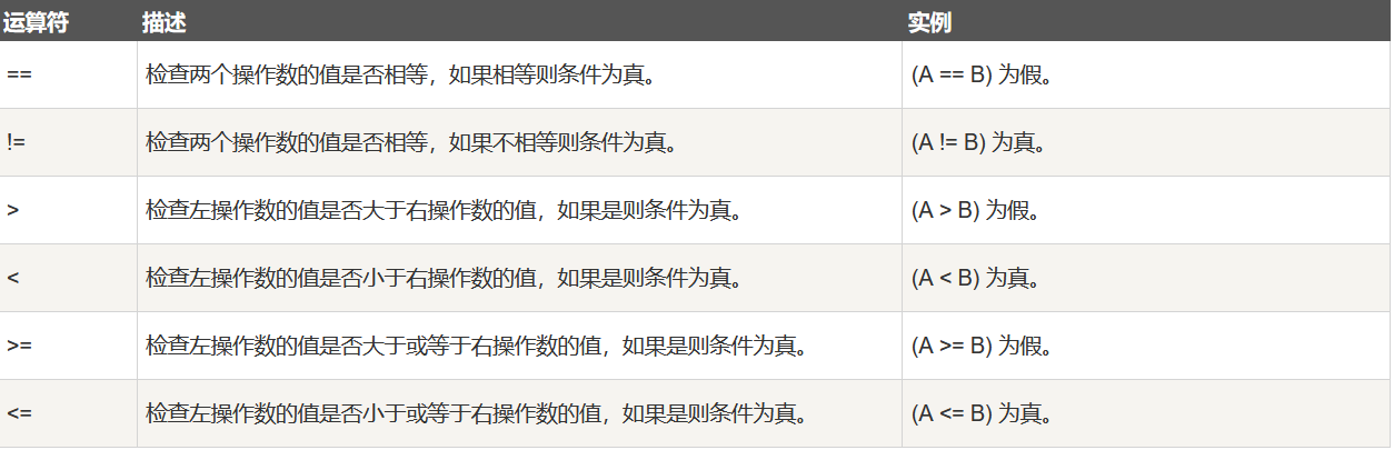 下表显示了 C 语言支持的所有关系运算符。假设变量 A 的值为 10,变量 B 的值为 20,则: