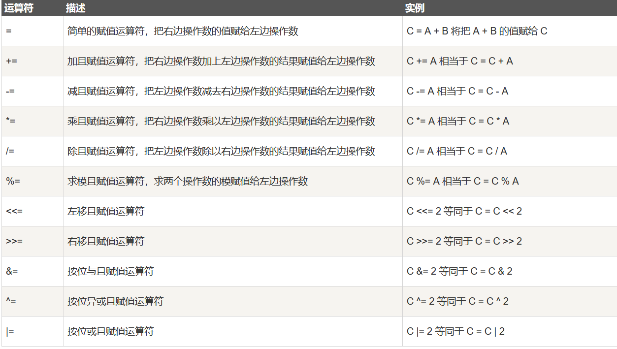 请看下面的实例,了解 C 语言中所有可用的赋值运算符: