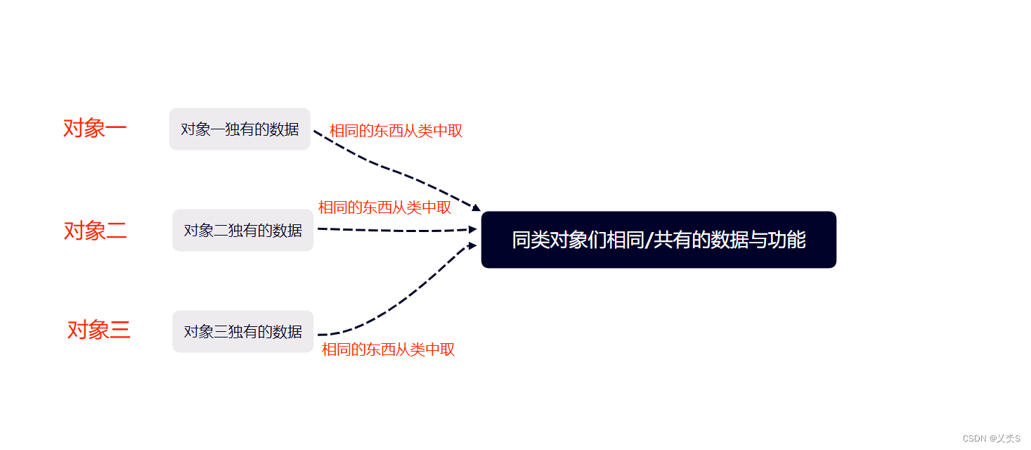 - 类:类即类别/种类,是面向对象分析和设计的基石,如果多个对象有相以的数据与功能,那么该多个对象就属于同一种类。有了类的好处是:我们可以把同一类对象相同的数据与功能存放到类里,而无需每个对象都重复存一份,这样每个对象里只需存自己独有的数据即可,极大地节省了空间。所以,如果说对象是用来存放数据与功能的容器,那么类则是用来存放多个对象相同的数据与功能的容器。