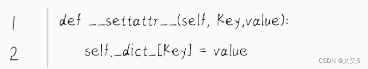 __setattr__是一个特殊方法(也称为魔术方法或魔术函数),用于设置属性的值。当你尝试给一个对象的属性赋值时,__setattr__方法会被自动调用。