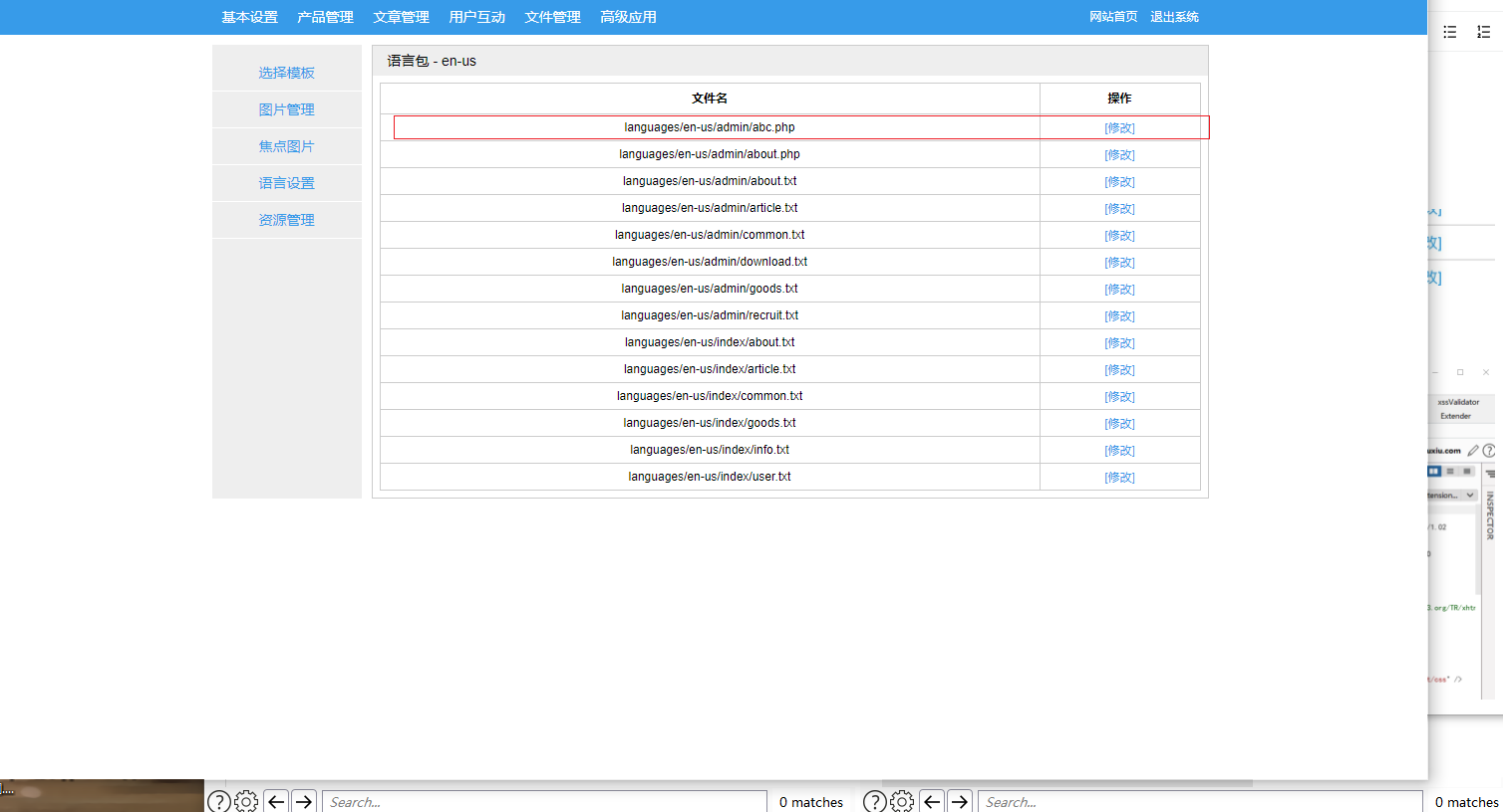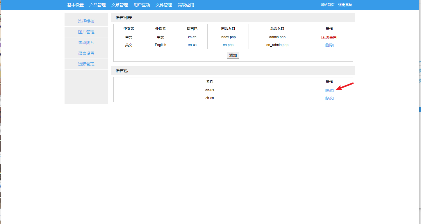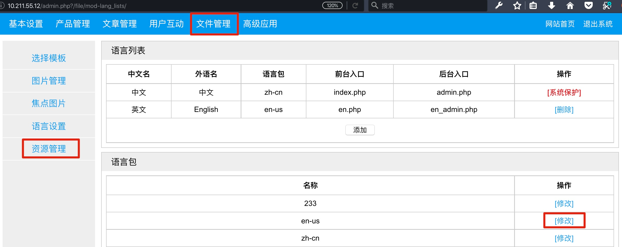 「文件管理」-「资源管理」-「语言包」-「en-us/zh-cn」-「修改」