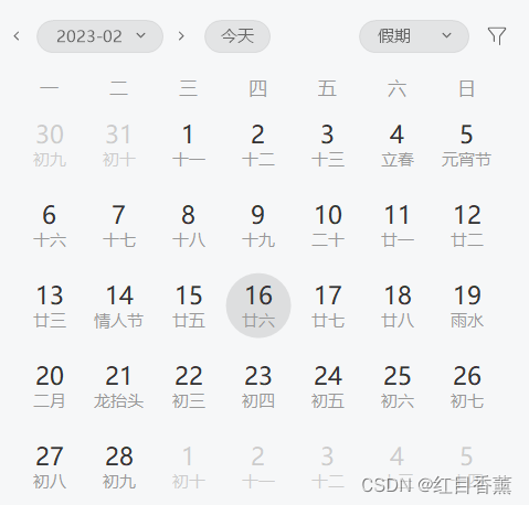 这个是从实际2023年2月的日历,与咱们遍历的是一致的,计算好对应的星期起始很重要。