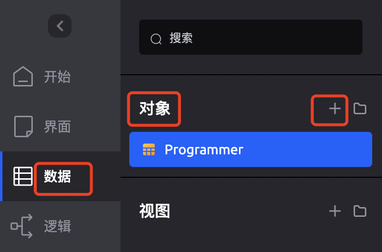 在左侧导航栏中,选择「数据」,单击「对象」后的「➕」,进入添加对象页面。