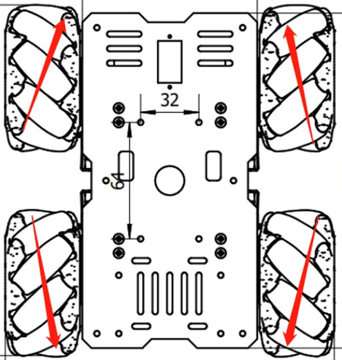 4)注意麦克纳姆轮的安装顺序和前后轮位置,否则可能会影响小车的平移和原地旋转效果,左右麦克纳姆轮上的扁状滚轮上的摩擦力方向需要均指向小车的中轴线方向,如下图所示。