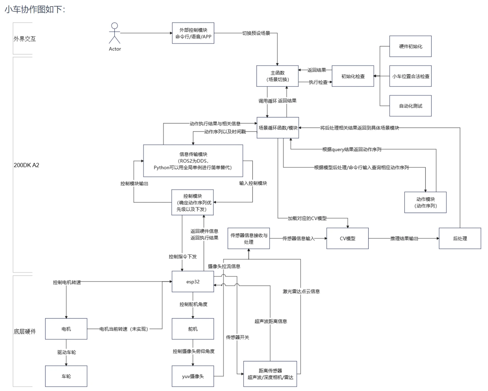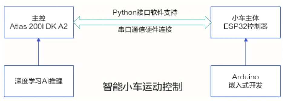 智能小车通过摄像头感知周围环境自主地进行运动控制,采集环境数据后在开发者套件上进行AI推理,根据推理结果发出指令控制小车的运动状态。小车运动状态的控制需要借助ESP32微控制器,使用Arduino平台可以对其进行嵌入式开发。主控与小车主体间控制指令的发出和数据的返回,过串口协议进行双向通信。协作框图如下:
