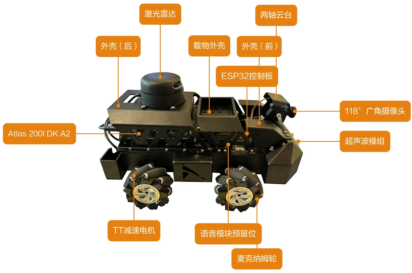 需要依照从下至上的顺序组装小车,组装底盘上的连接件,按照“电池 > TT直流电机 > 麦克纳姆轮 > 广角摄像头模块 >ESP32单片机 > 第一层外壳 > 超声波模块 > 语音麦克风阵列 > Atlas 200I DK A2开发者套件 > 激光雷达连接到后段外壳 > 前中段外壳顺”序组装。详细步骤见官方文档:https://www.hiascend.com/document/detail/zh/Atlas200IDKA2DeveloperKit/23.0.RC1/Application%20Cases/ivadg/ivadg_0014.html